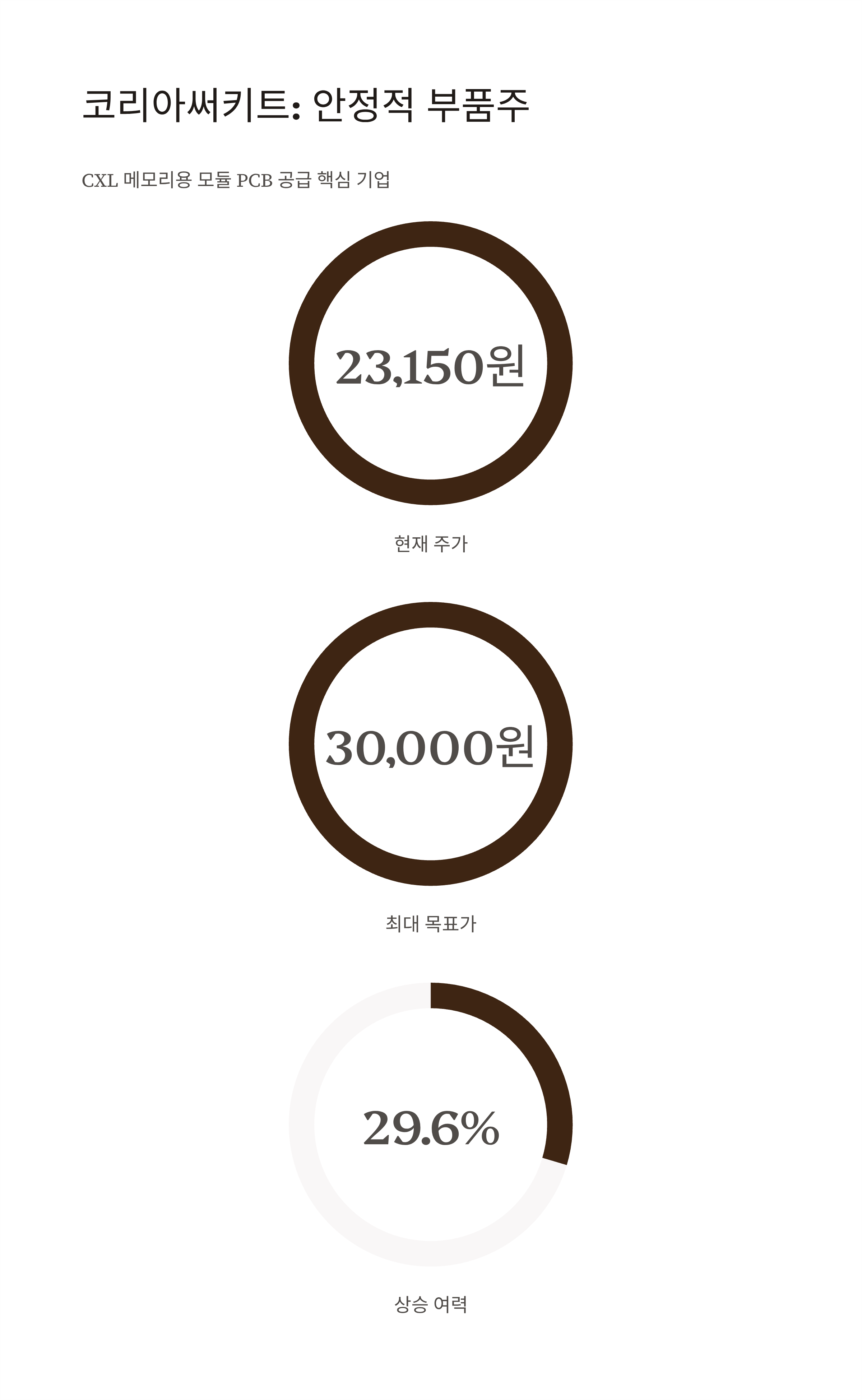 코리아써키트는 반도체 모듈용 PCB 전문 기업으로, CXL 메모리에 들어갈 모듈 PCB를 공급할 것으로 기대되고 있습니다.
