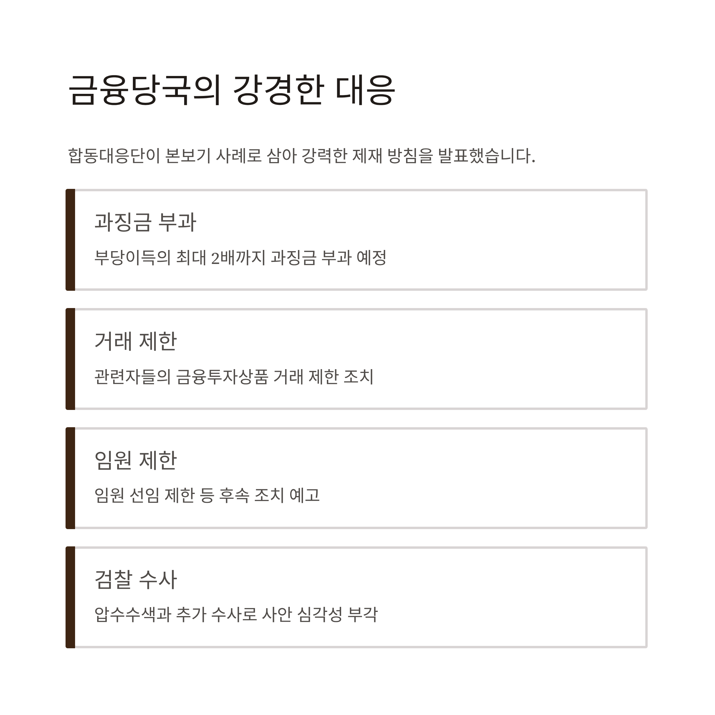 합동대응단은 이번 사건을 ‘본보기’로 삼아 강력한 제재 방침을 밝혔습니다. 부당이득의 최대 2배에 달하는 과징금과 함께, 관련자들의 금융투자상품 거래 제한, 임원 선임 제한 등 후속 조치가 예고된 상태입니다. 검찰 또한 압수수색과 추가 수사를 통해 사안의 심각성을 부각시키고 있습니다.