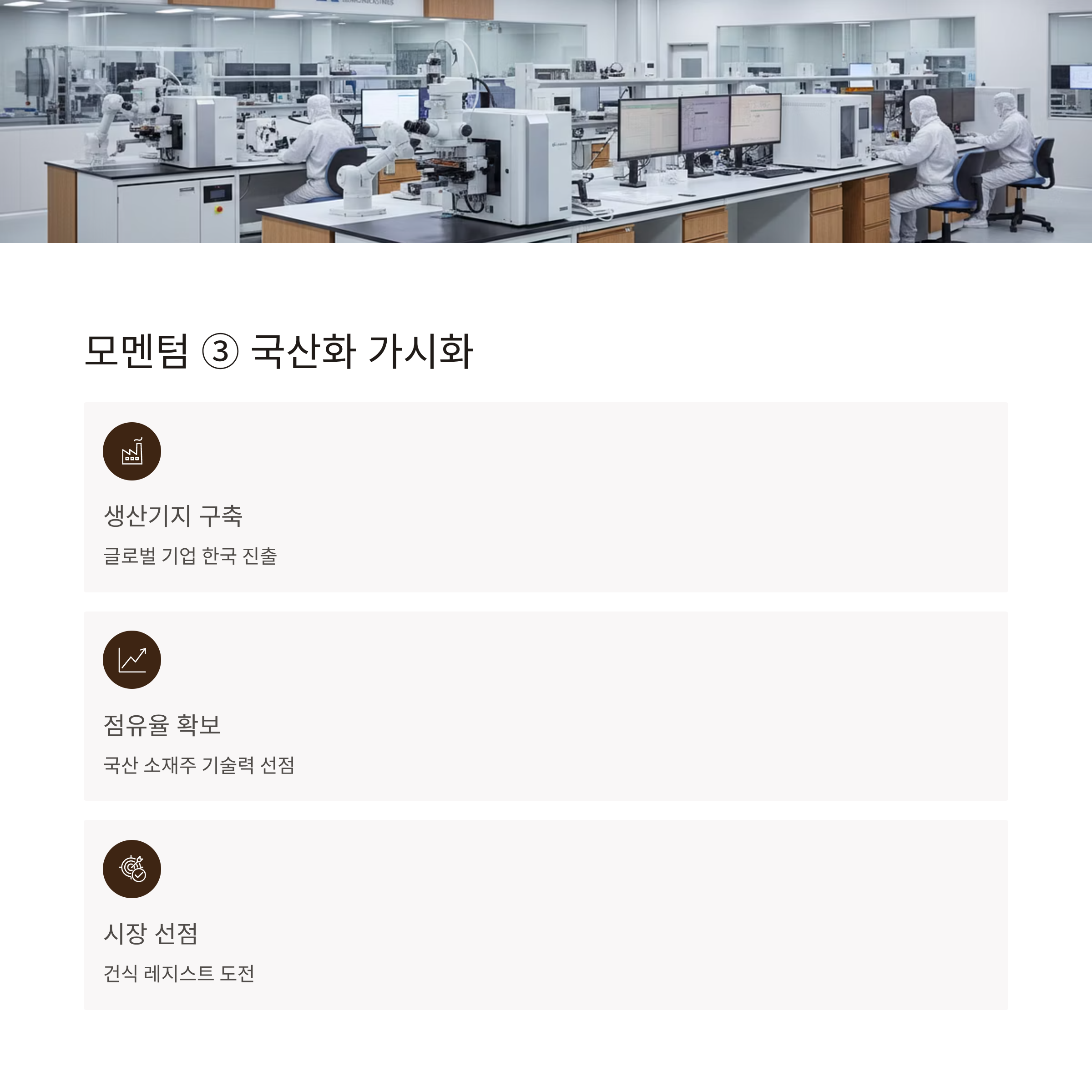 | 소재 | 동진쎄미켐, 와이씨켐 | 포토레지스트(PR), 린스 | PR 국산화 + 건식 레지스트 |