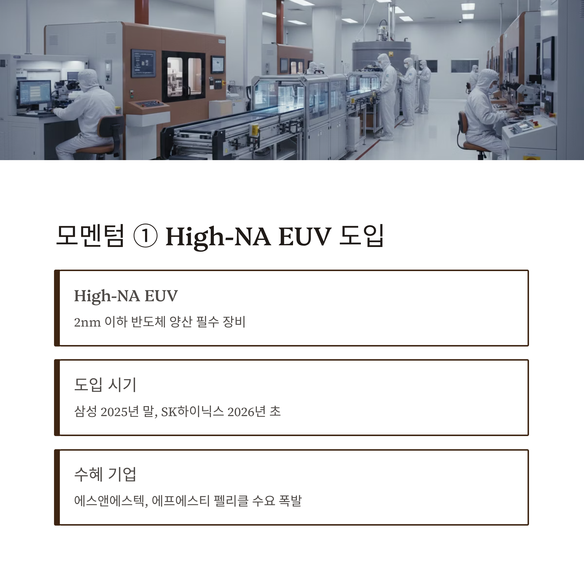삼성전자와 SK하이닉스의 High-NA EUV 장비 도입, 국내 핵심 부품 양산의 시작, 그리고 AI 반도체 수요 급증이라는 3박자가 맞물리면서 실적 기반의 테마 장세가 펼쳐질 가능성이 높습니다.