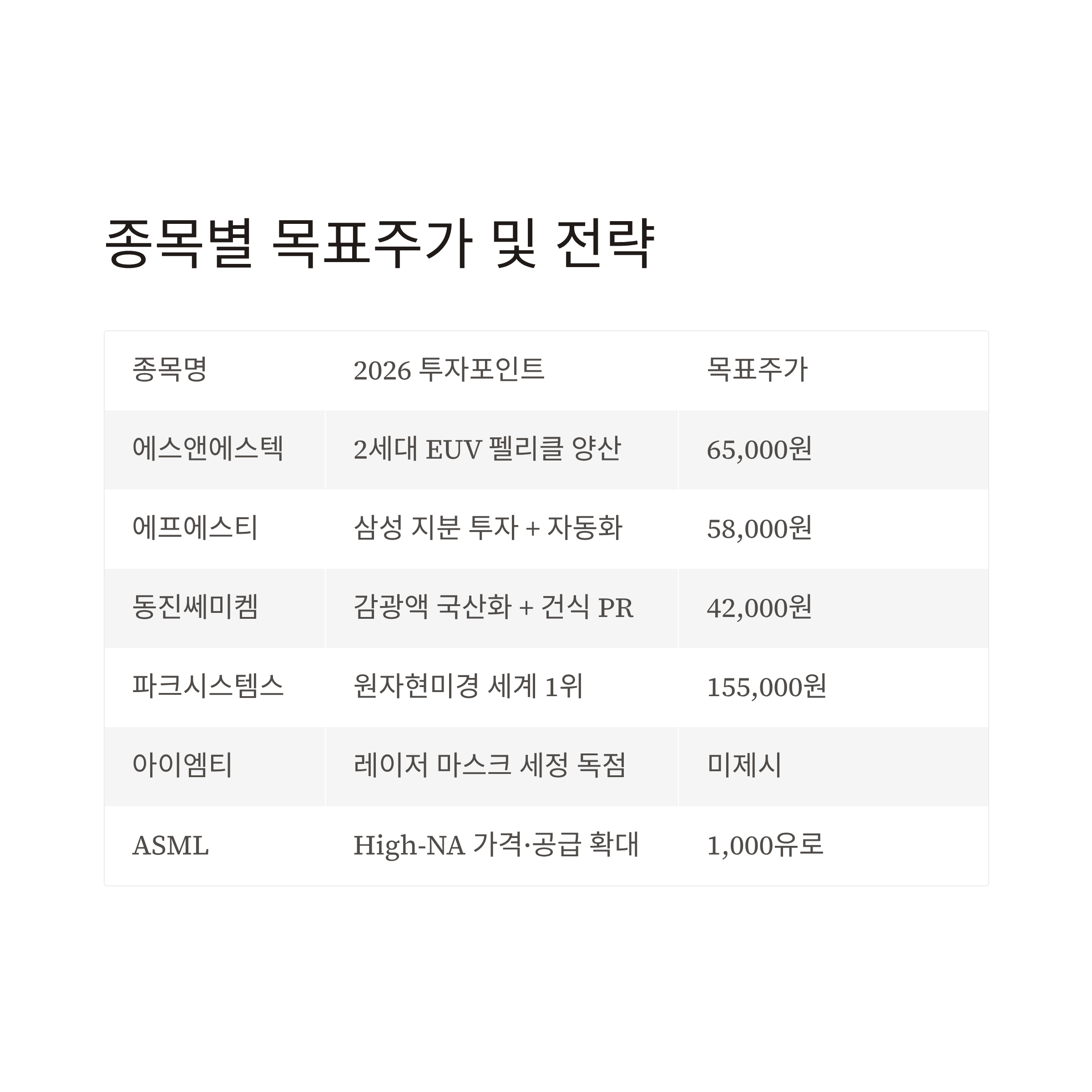 | 소재 | 동진쎄미켐 | EUV 감광액 국산화 + 건식 PR 개발 중 | 42,000원 (DB) | 실적 기반 안정주 |