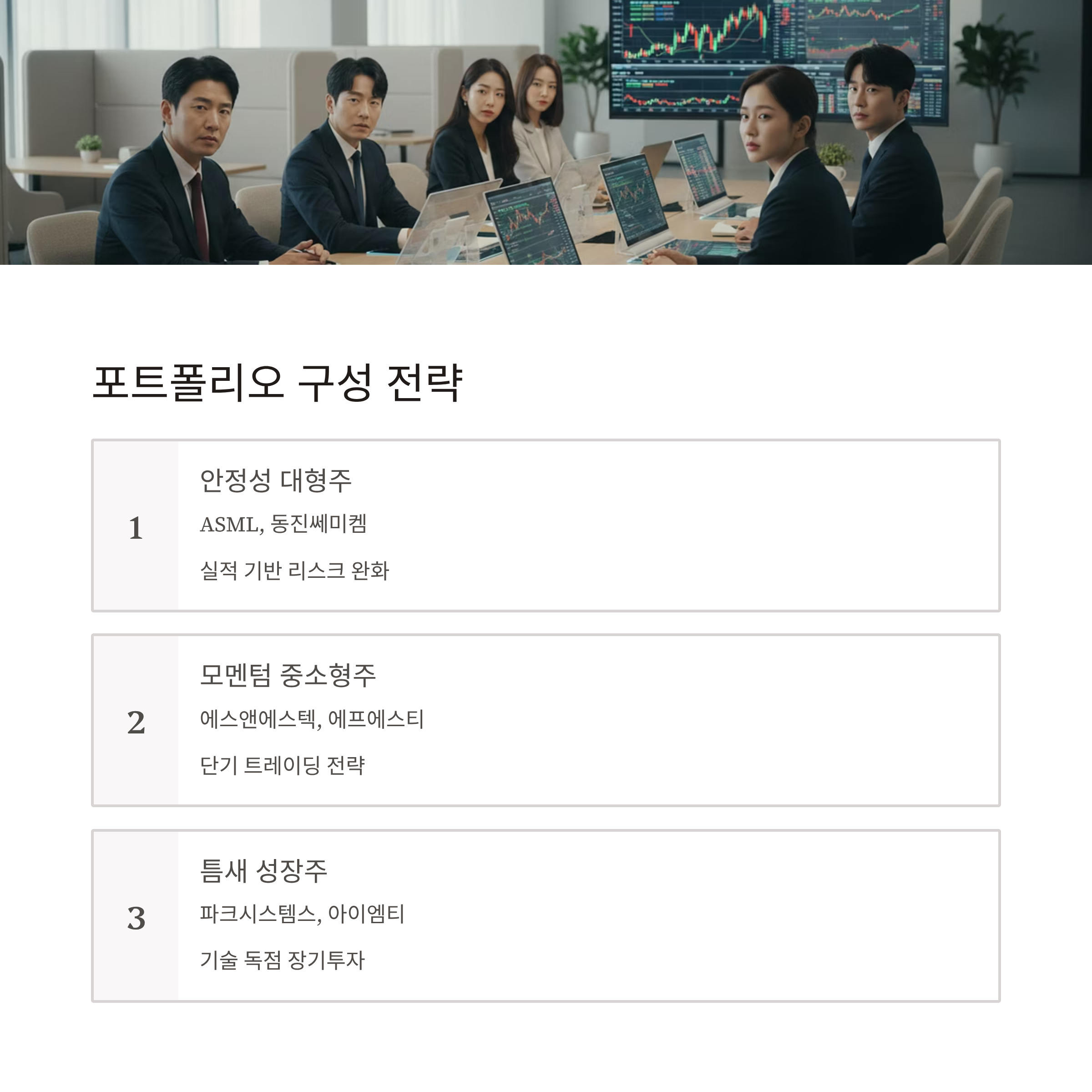 | 안정성 기반 대형주 | ASML, 동진쎄미켐 | 실적 기반 포트폴리오 하단에 넣어 리스크 완화 |