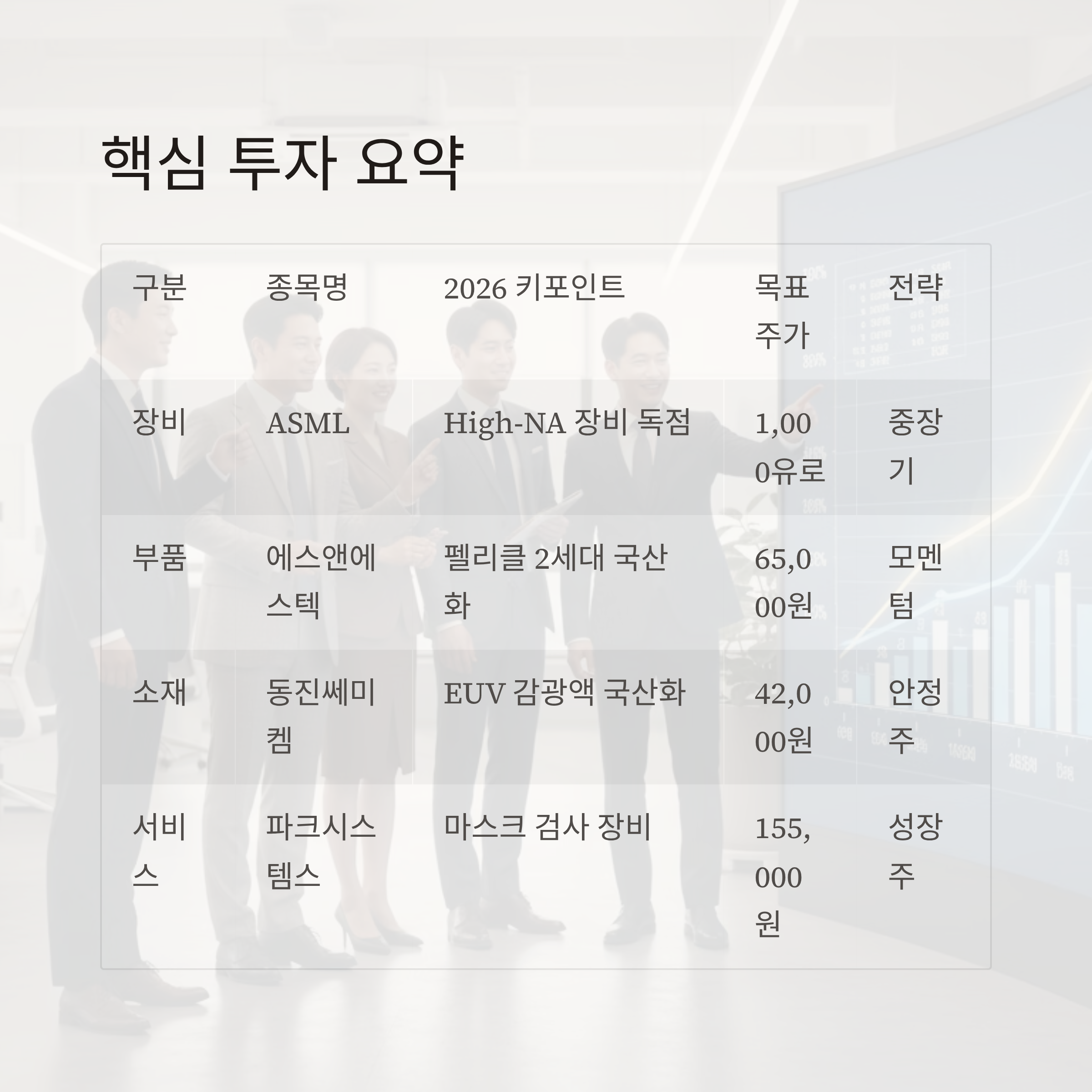 | 장비 | ASML | High-NA 장비 독점 공급 | 약 1,000유로 | 중장기 안정 투자 |