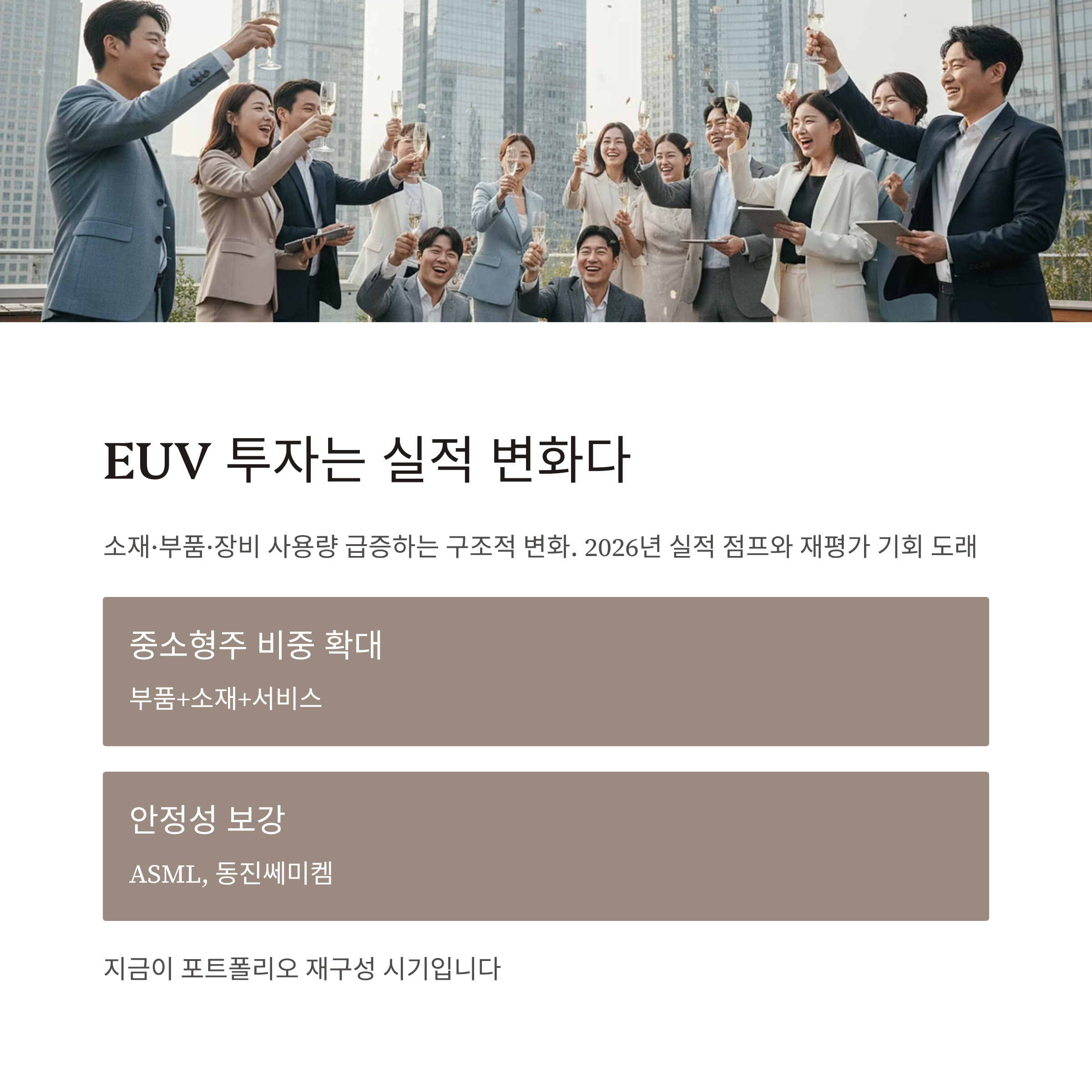 이번 글에서는 EUV 관련 기업들을 장비, 부품, 소재, 서비스 영역으로 나눠 각 종목의 투자전략과 2026년 주가 재평가 요인을 정리해 드립니다.