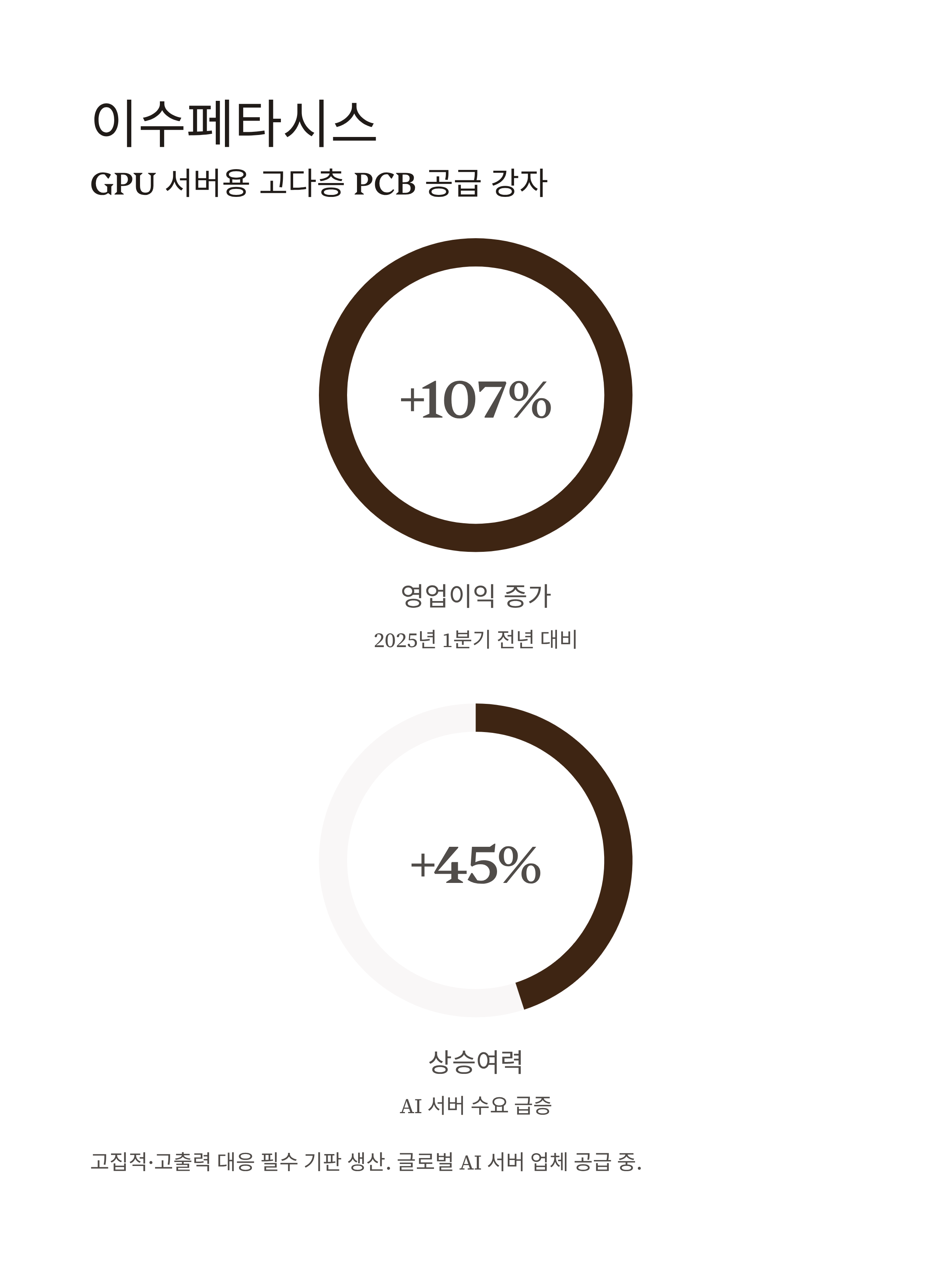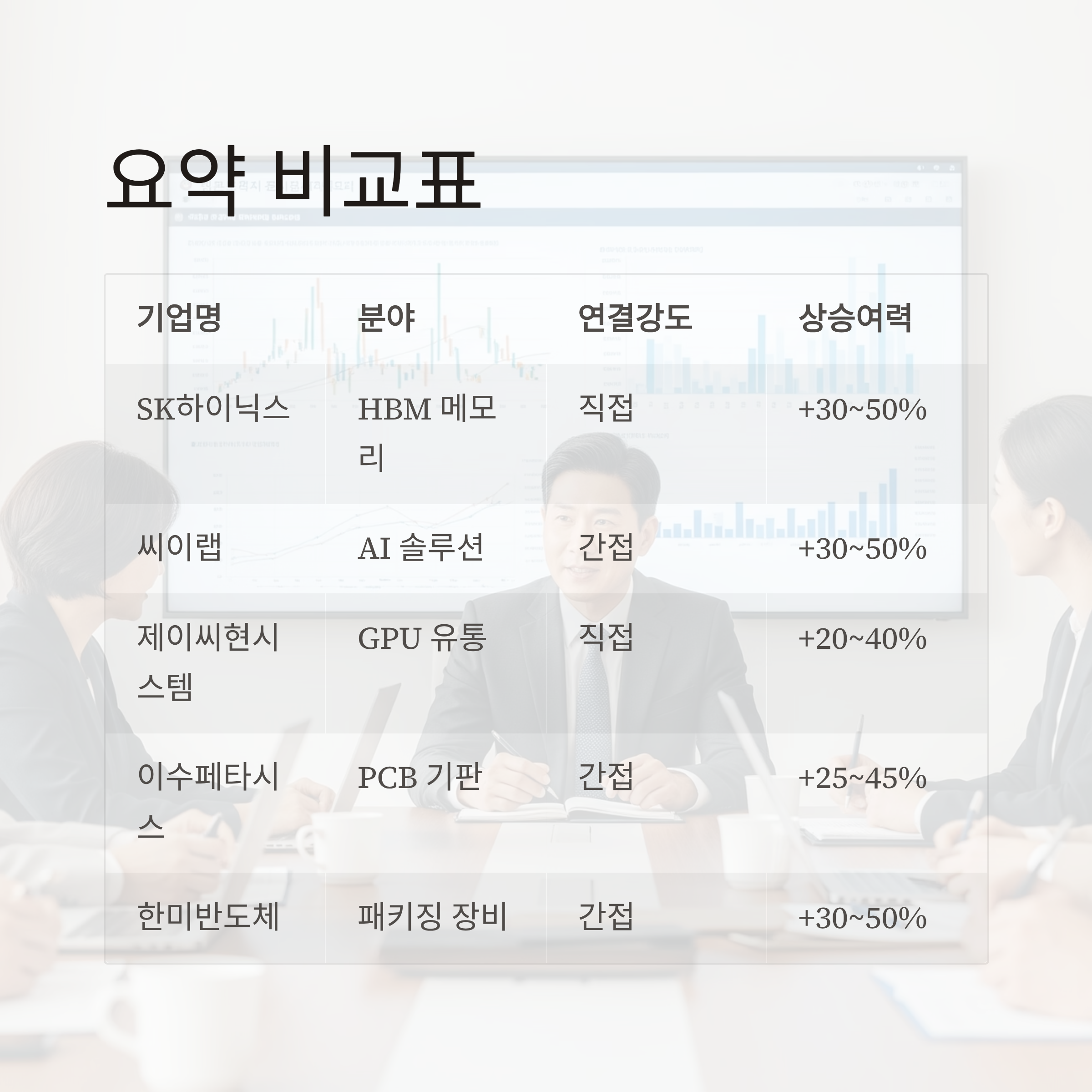 | 이수페타시스 | GPU 서버용 PCB 기판 공급사 | 고다층 PCB 기술력, AI 수요 확장 수혜 | +25% ~ +45% |