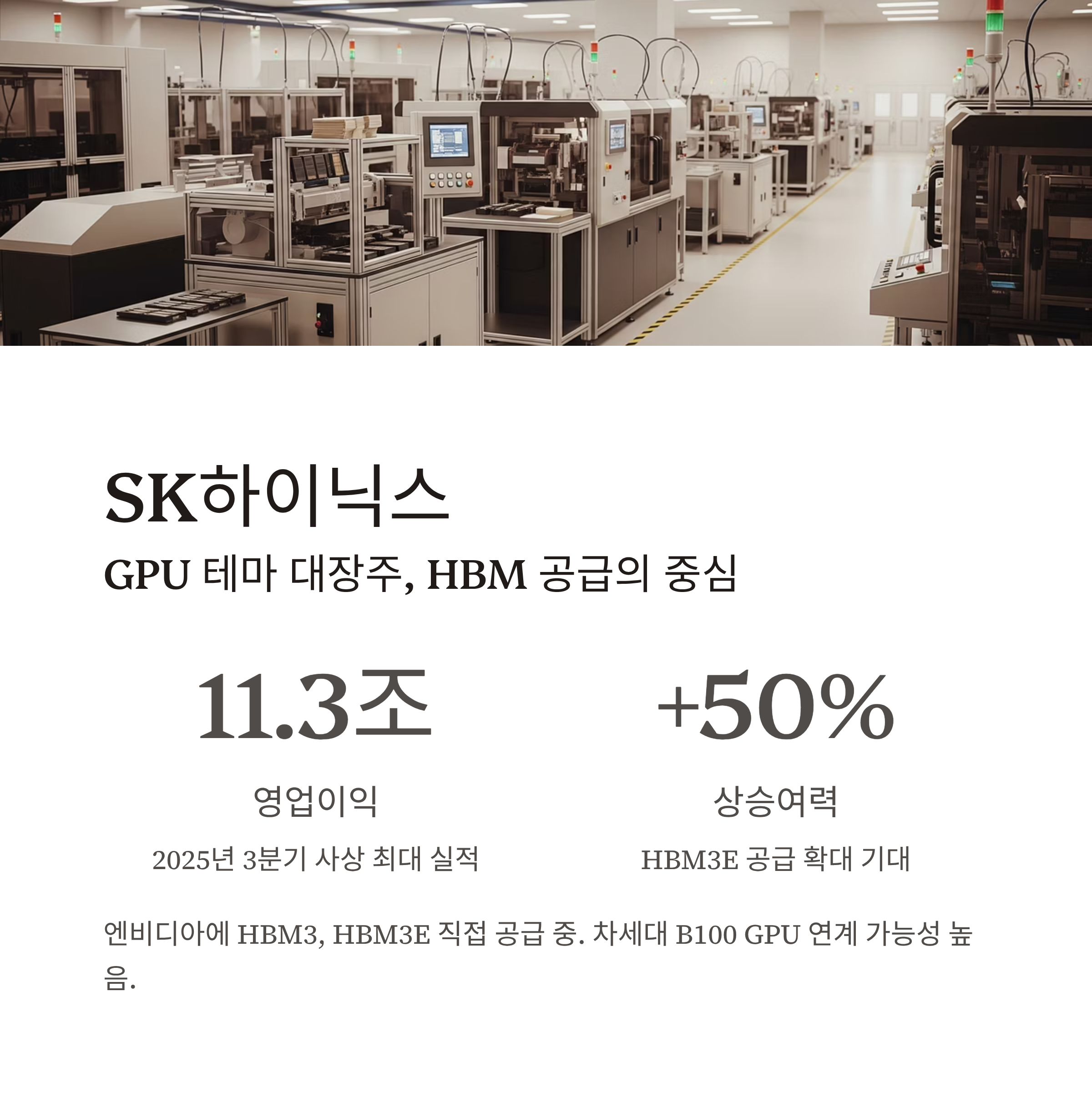 SK하이닉스는 엔비디아에 직접 HBM3, HBM3E 공급 중이며, 향후 B100 등 차세대 GPU에도 연계될 가능성이 높습니다.