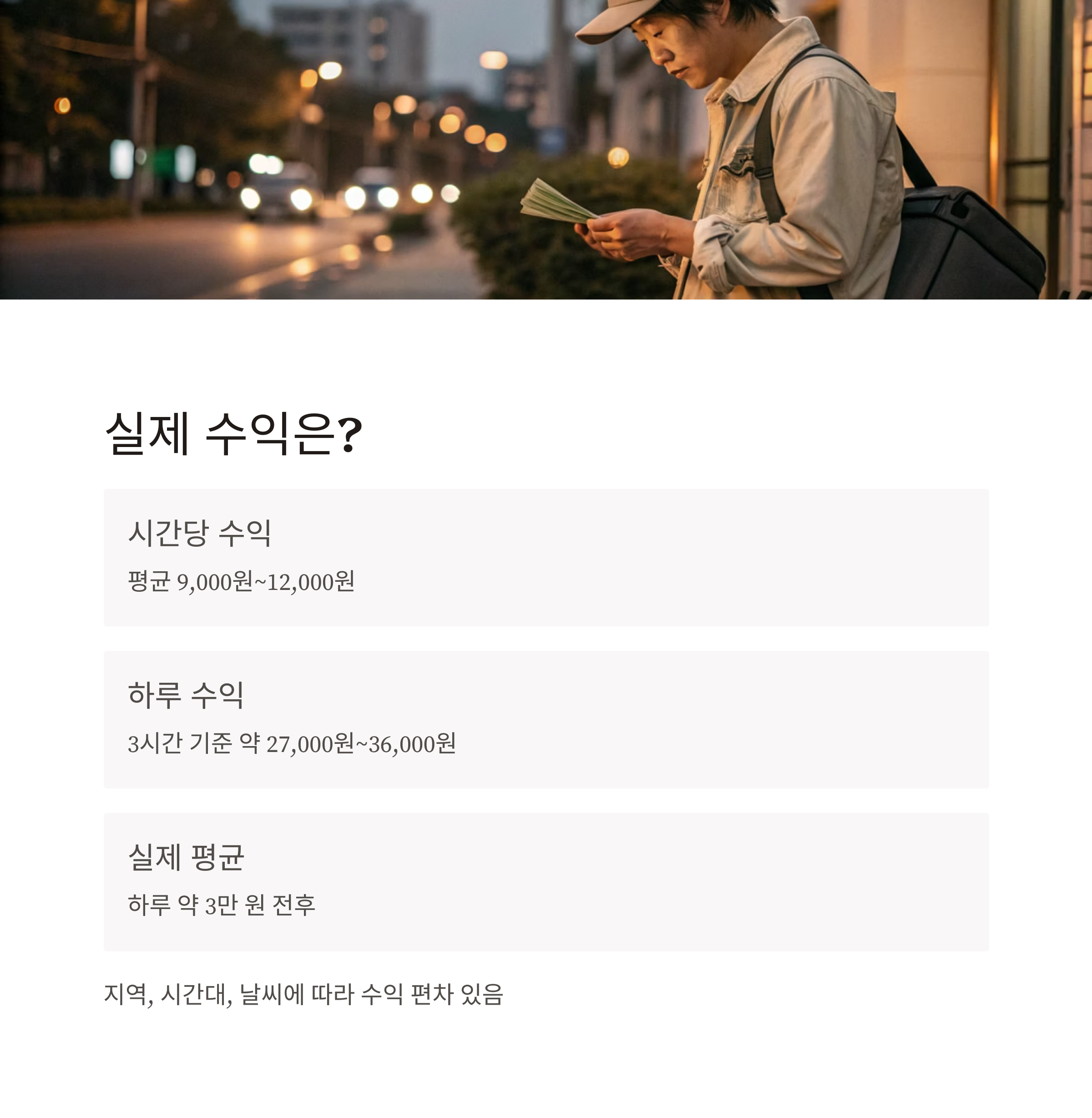 | 진입 장벽 | 매우 낮음 (누구나 가능) | 경쟁 배달 인원이 많은 지역은 배정 어려움 |