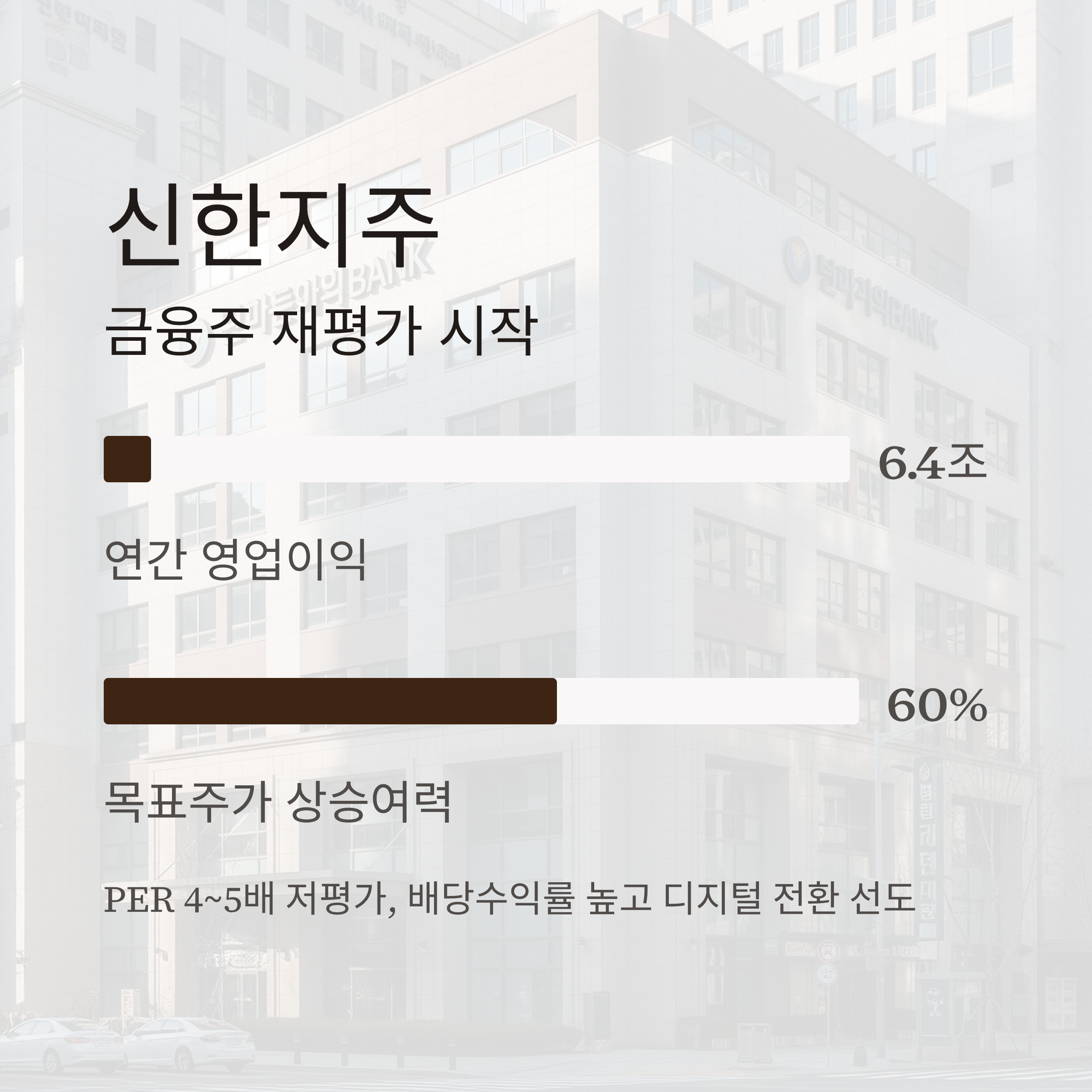 신한지주는 배당 수익률도 높고, 비은행 부문 확장, 디지털 전환 등에서 업계 선도적인 모습을 보이고 있죠.