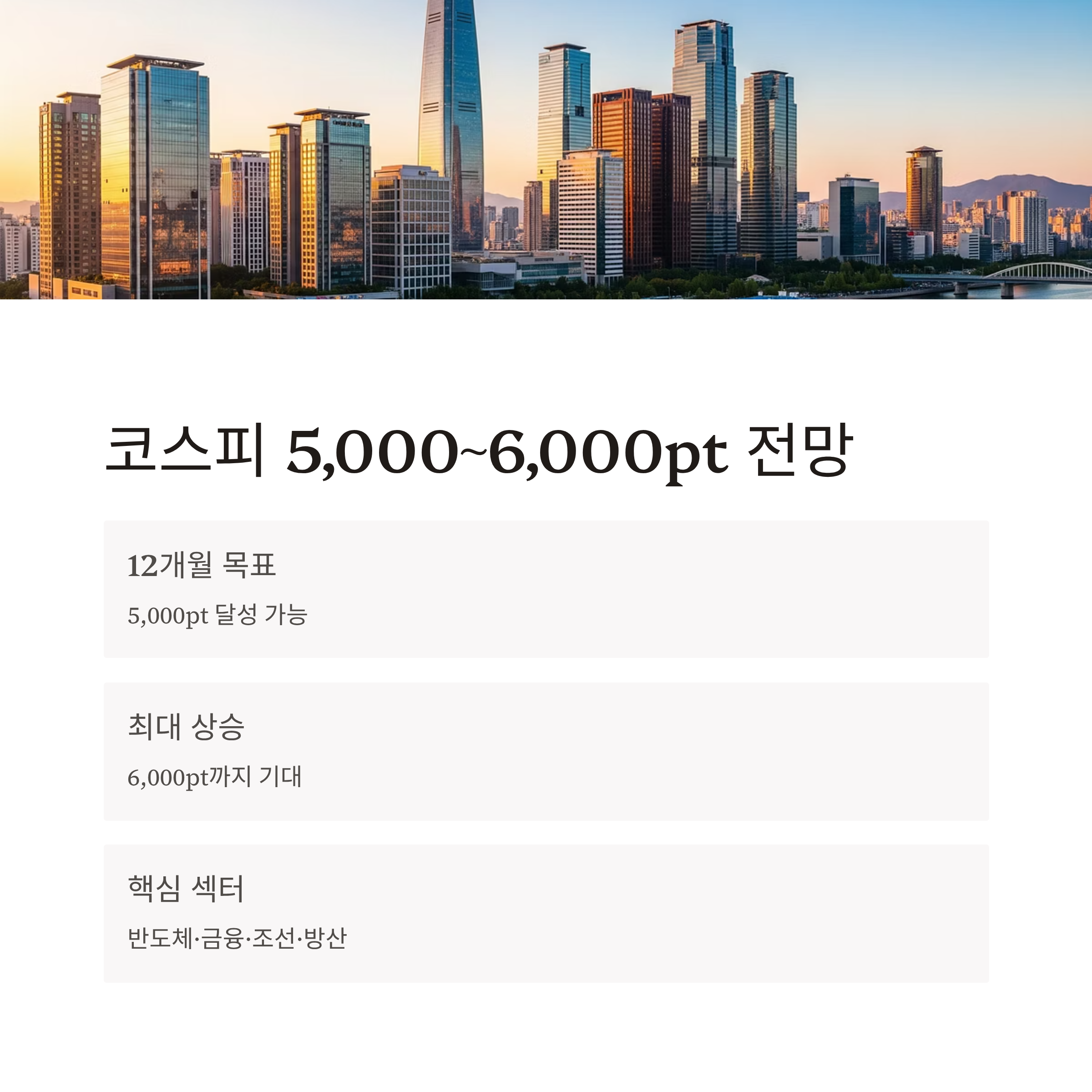 - 분할 매수 전략이 유효합니다. 6,000pt는 ‘과정’이 중요하며 단기 급등 후 조정 가능성도 열어둬야 합니다.