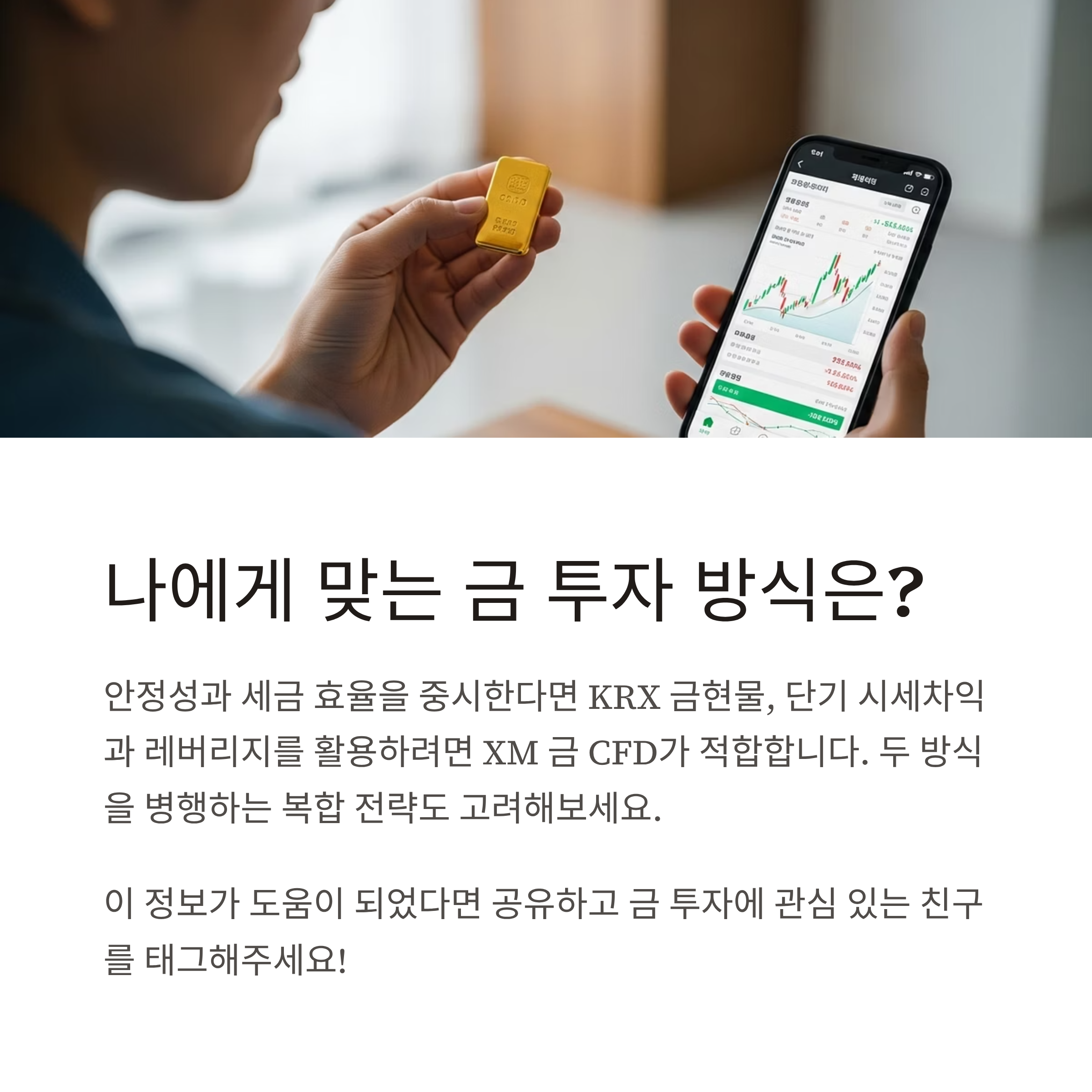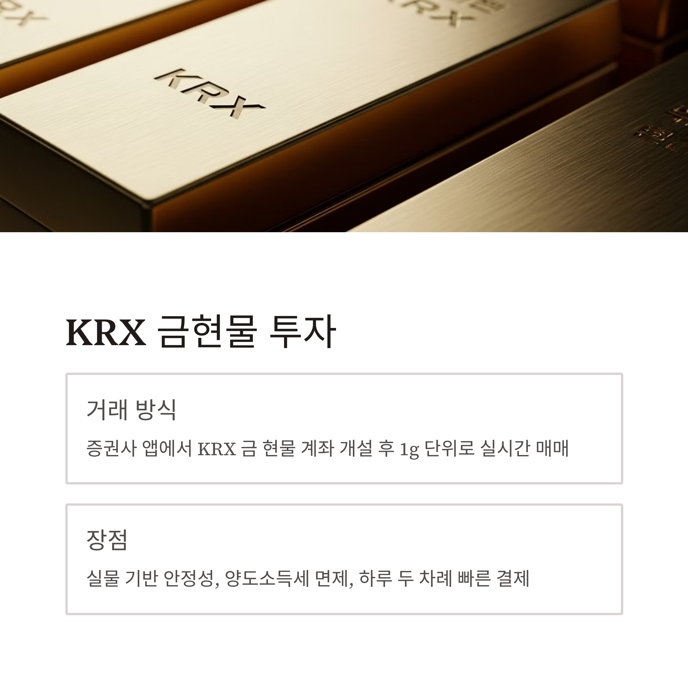 - 안정성·세금 효율 중시: KRX 금현물 계좌를 통한 장기 보유·헷지 목적 투자