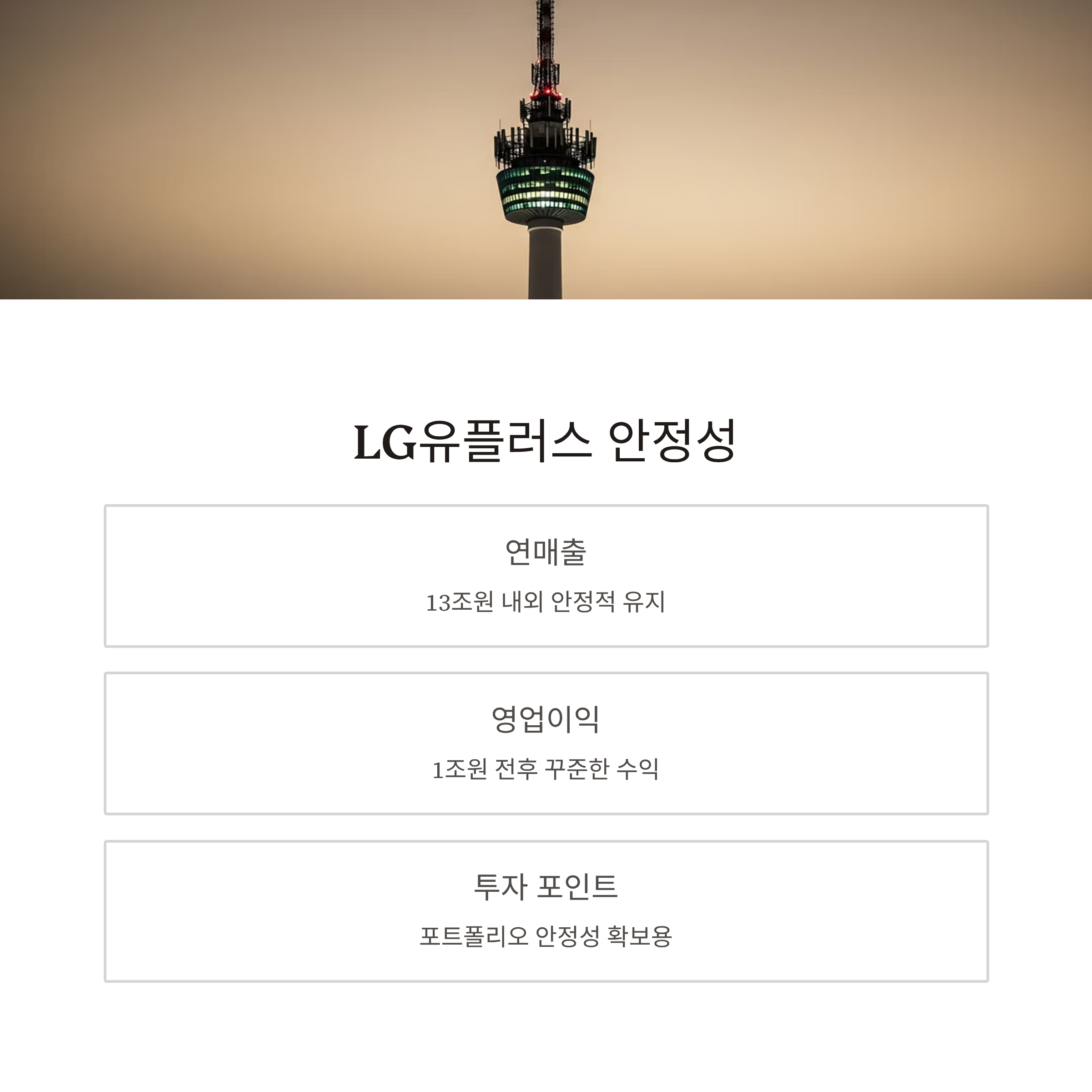 LG유플러스는 통신 서비스 부문을 담당하며, 상대적으로 안정적인 수익 구조를 유지하고 있습니다. 매년 꾸준한 매출과 배당을 창출하지만, 성장성은 제한적이라는 평가도 공존합니다.