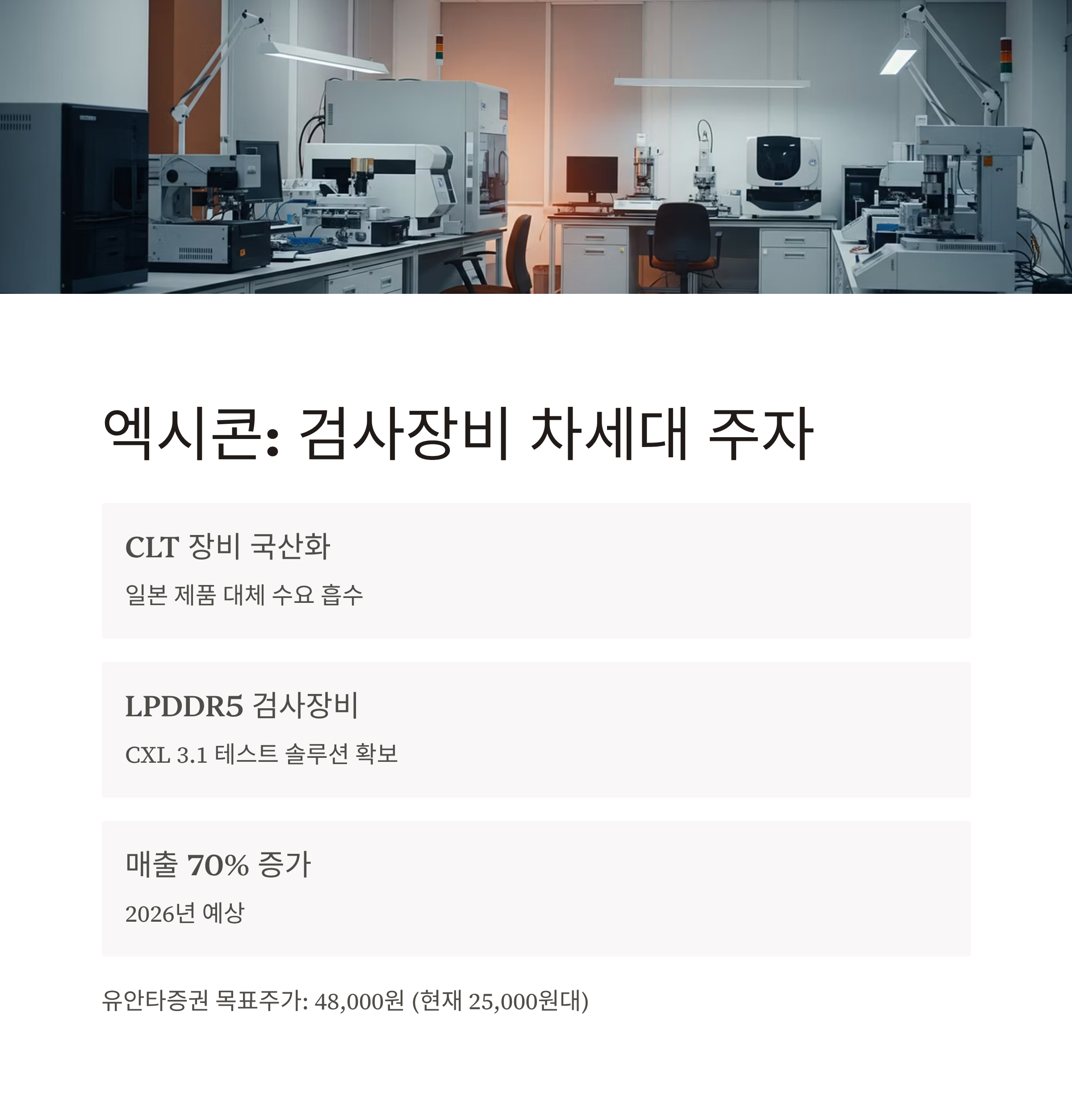 | 엑시콘 | CLT 장비 매출 시작 | LPDDR5 테스터 매출 본격화 | 48,000원 (유안타) |