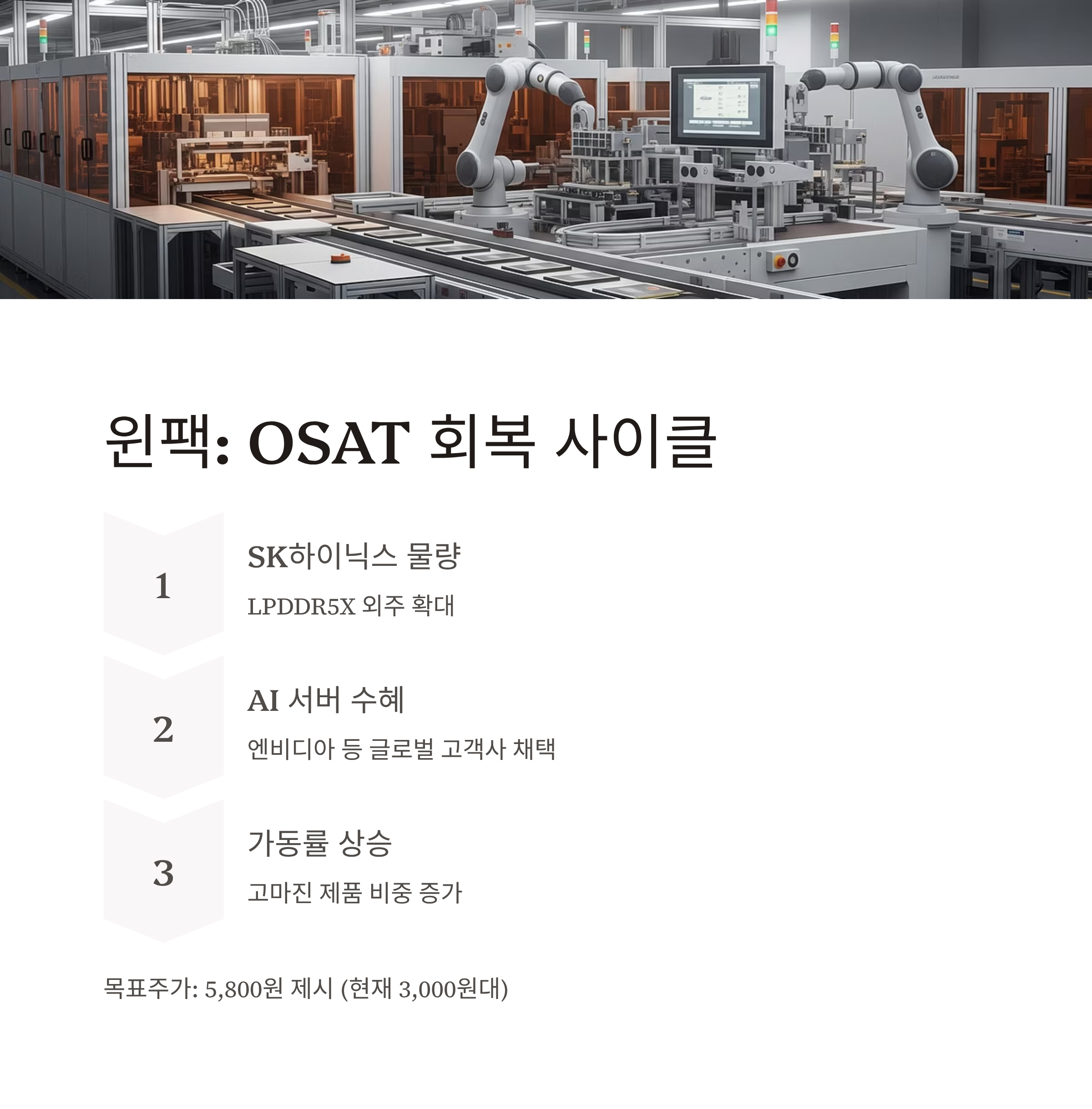 | 윈팩 | 메모리 패키징 회복 | 서버용 LPDDR 외주 증가 | 5,800원 (리서치 참고) |