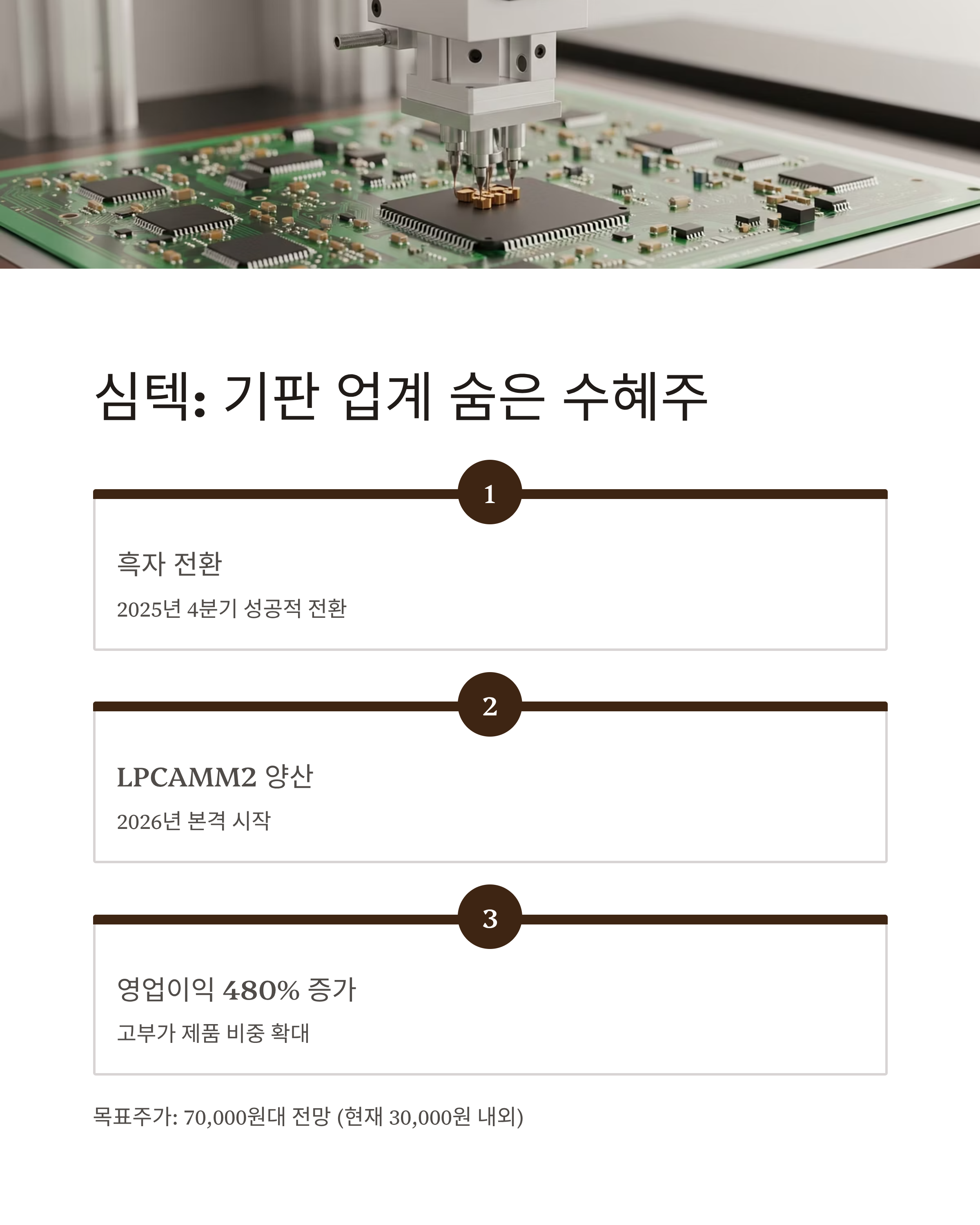 | 심텍 | 흑자 전환 성공 | 소캠 양산 / 고부가 기판 확대 | 70,000원대 (예상) |