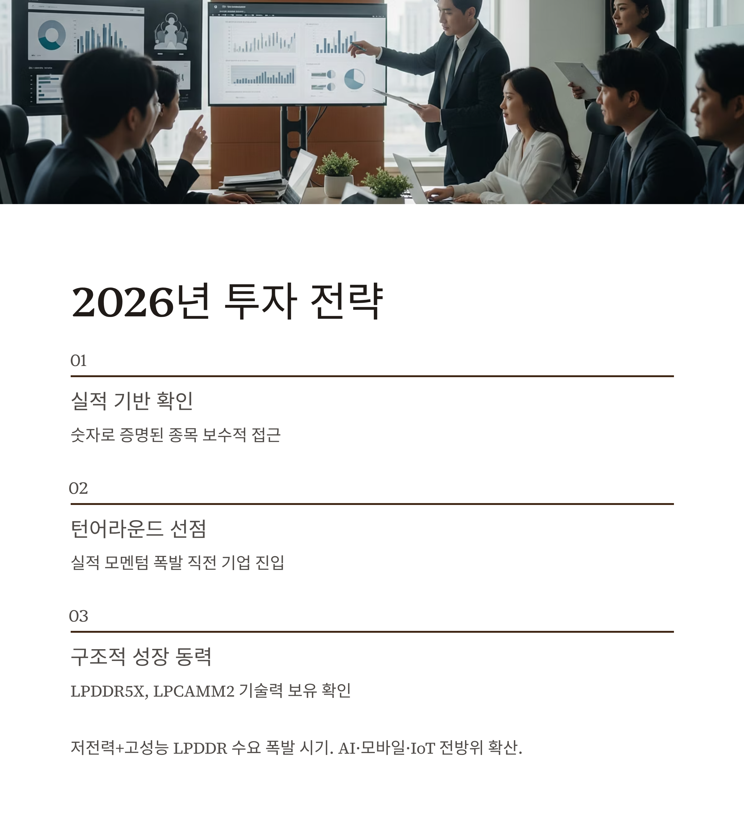 - 장기 구조적 성장 동력 보유 확인: 단순 매출 회복이 아닌 세대교체형 기술력(LPDDR5X, LPCAMM2 등) 보유 여부가 핵심입니다.