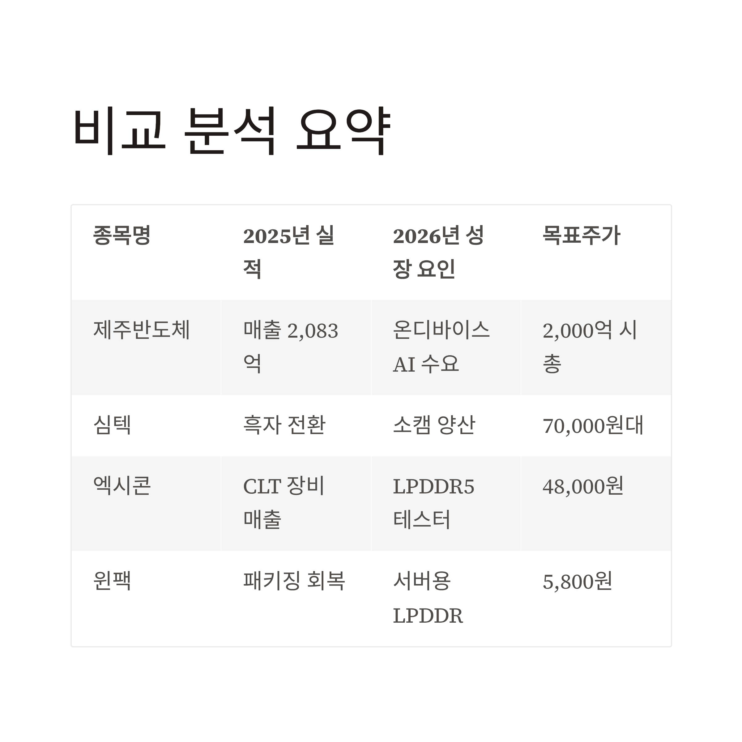 종목명2025년 실적 (누적)2026년 핵심 성장 요인목표주가 전망 (있을 경우)