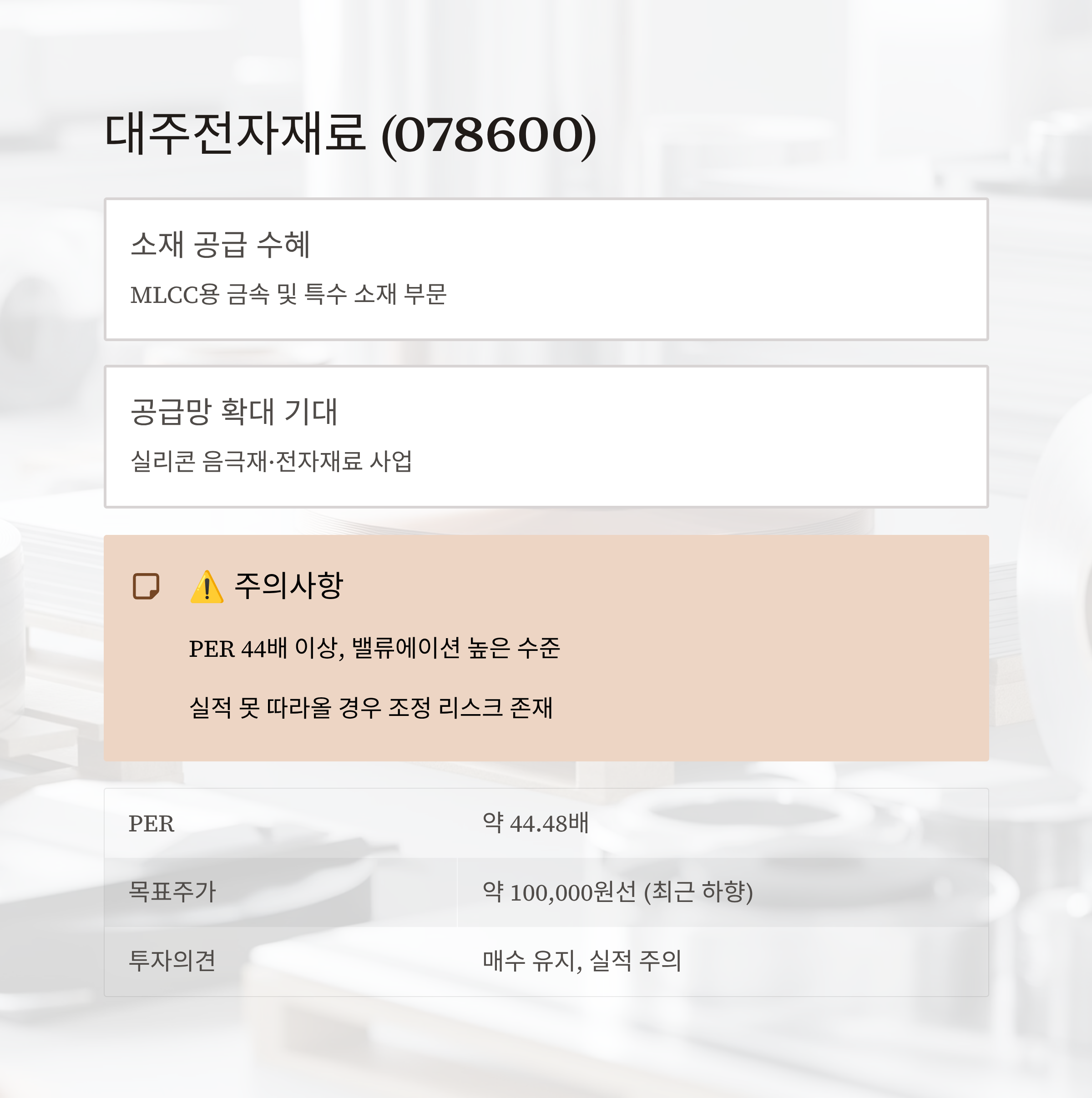 | 대주전자재료 | 소재·부품 공급 | MLCC용 금속·전자재료 | 실적 증가세 | 기대 선반영, 실적 따라야 유지 |