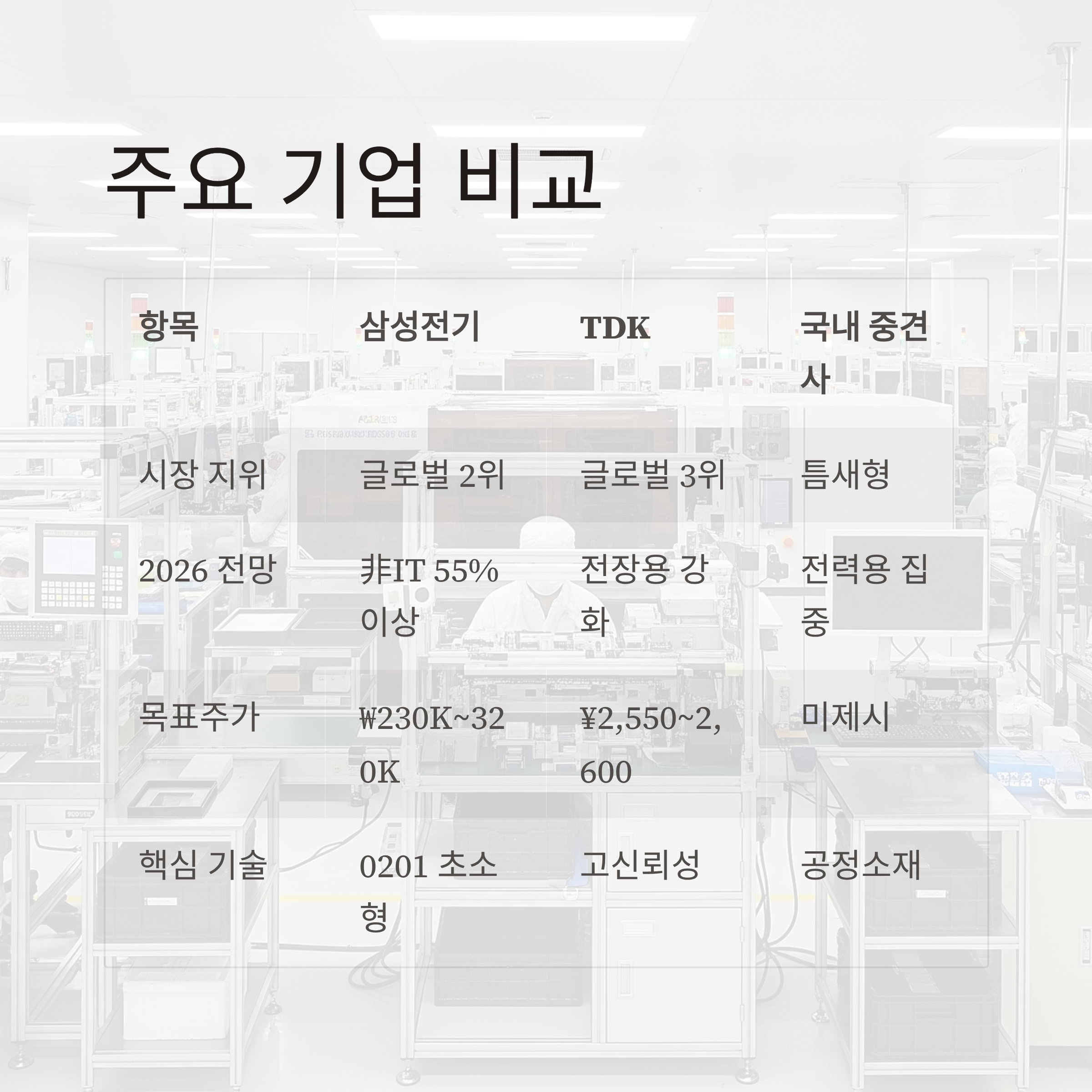 항목삼성전기 (009150.KS)TDK Corp (6762.T)삼화콘덴서 등 기타 국내주