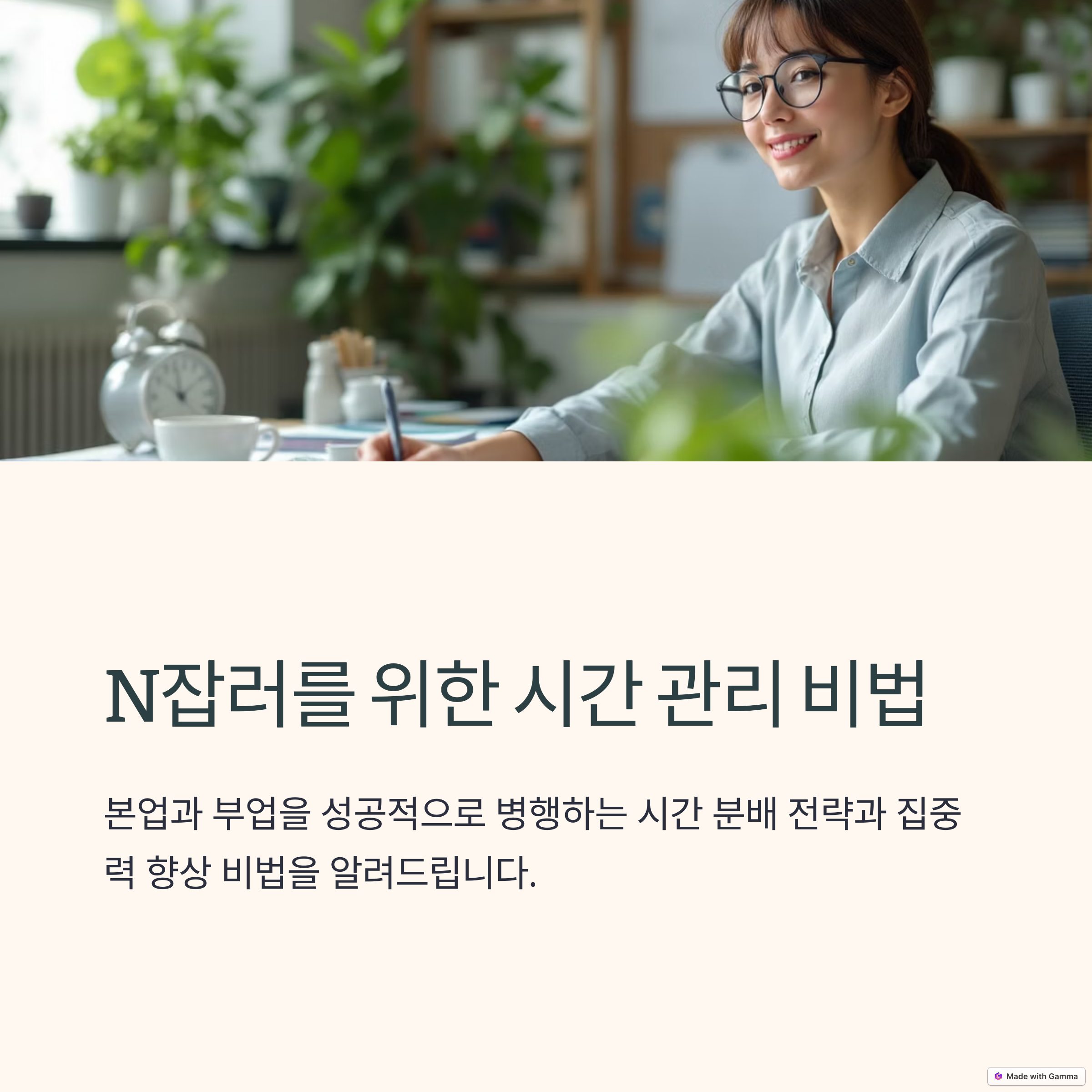 N잡 시대, 모든 시간을 효율적으로 쓸 수는 없습니다. 하지만 계획을 세우고 반복 실천하는 루틴을 만든다면 본업과 부업 모두 놓치지 않는 삶이 가능합니다. 시간은 누구에게나 공평하지만, 쓰는 방식은 완전히 다릅니다. 이 글이 여러분의 하루에 작지만 강력한 변화를 가져오기를 바랍니다.