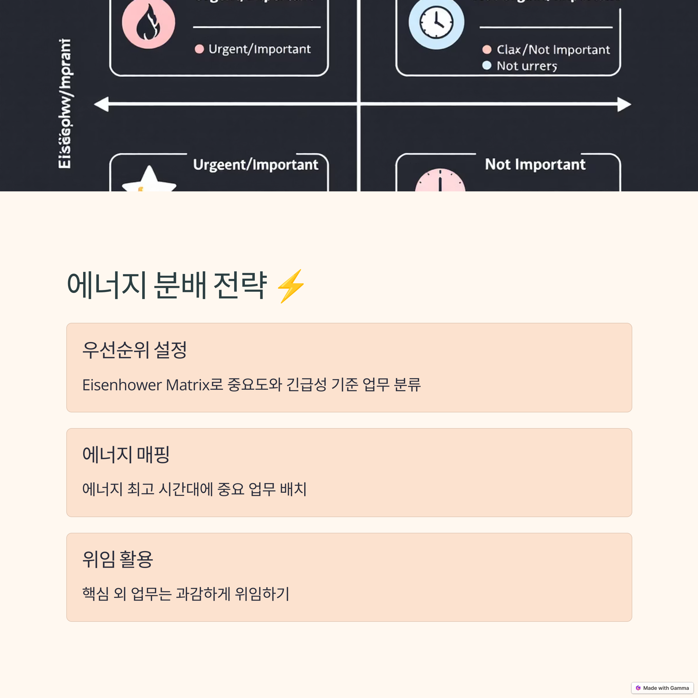 | 시간 블록 관리 | 루틴 점검 | 에너지 분배 전략 |