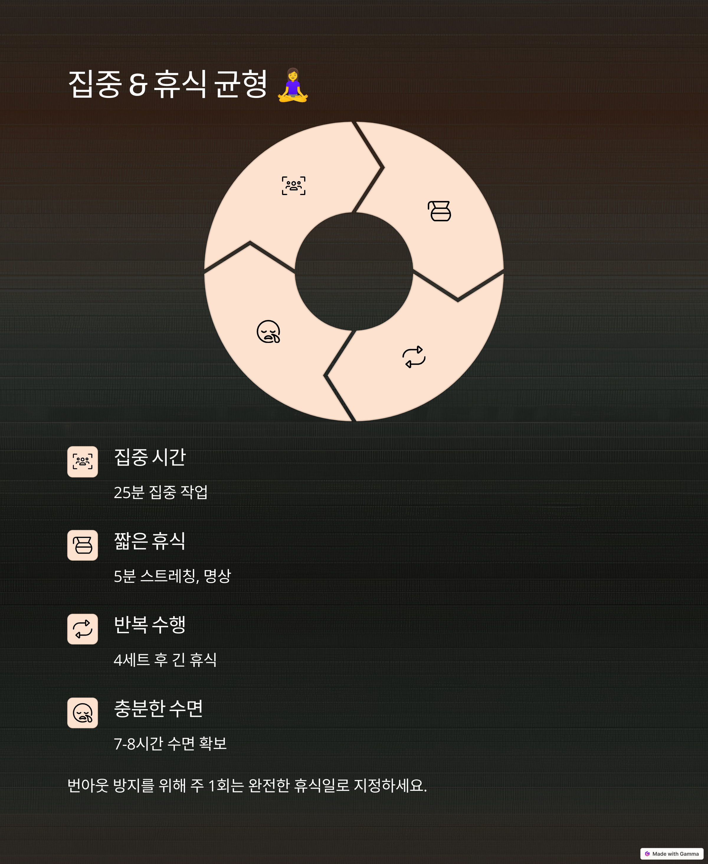 마지막으로 중요한 것은 집중과 휴식의 균형입니다. 무조건 많은 시간을 투자한다고 성과가 나오는 것은 아닙니다. 주중에는 집중 구간을 명확히 설정하고, 주말이나 저녁에는 디지털 디톡스를 통해 두뇌 회복 시간을 가져야 합니다. 시간보다 에너지 관리가 더 중요할 수 있습니다. 커피나 에너지 드링크에 의존하지 않고 루틴 속에 산책, 운동, 명상 같은 자연스러운 회복 활동을 넣는 것도 좋은 전략입니다.