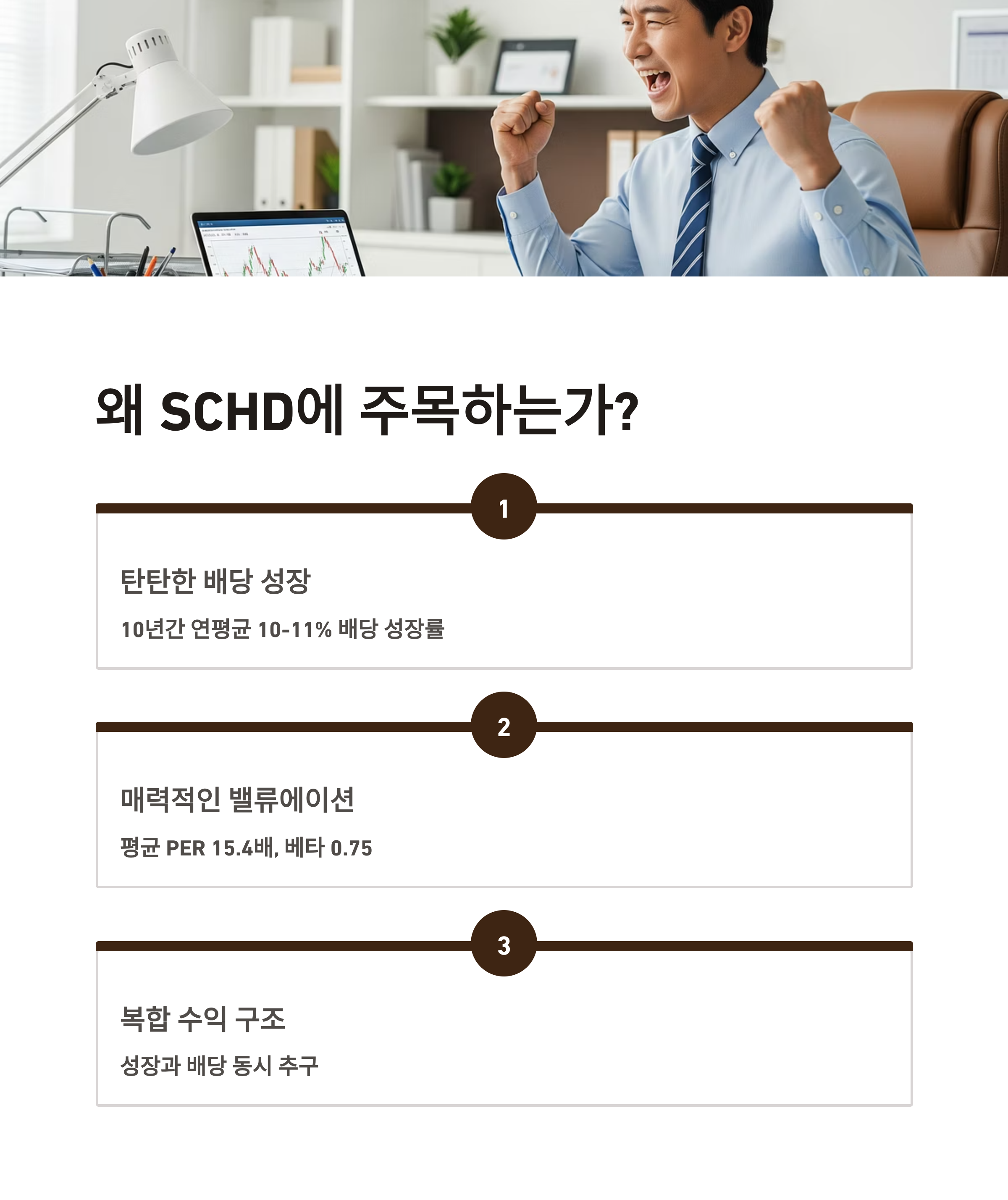 단순히 높은 배당이 아니라, 배당을 해마다 늘리는 기업들만 엄선합니다. SCHD의 지난 10년간 **연평균 배당 성장률은 약 10~11%**에 달합니다.
