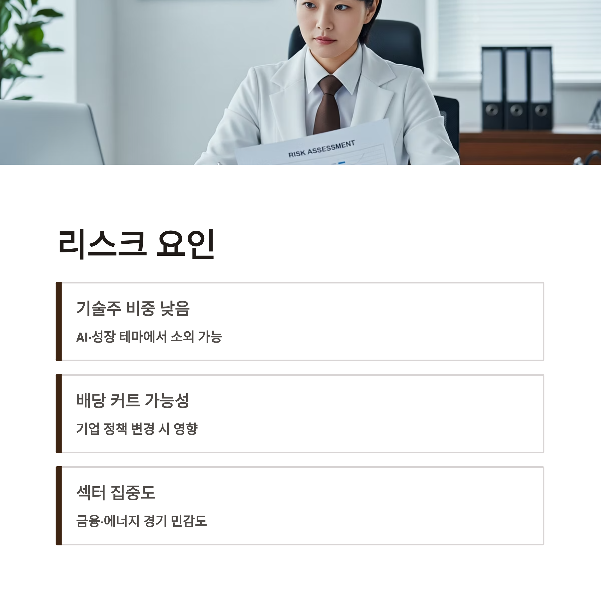 | 기술주 비중 낮음 | AI·성장 테마에선 소외될 수 있음 |