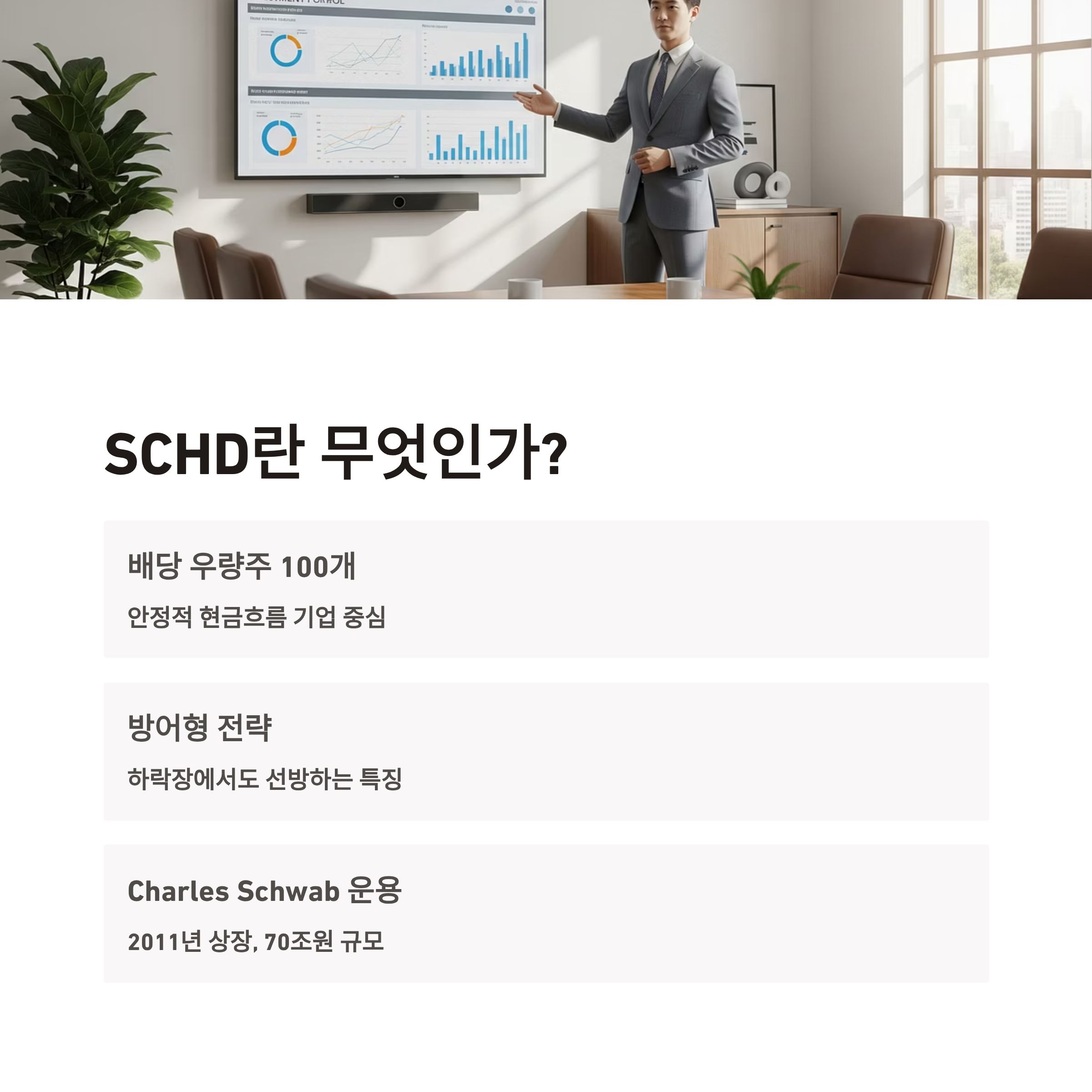 SCHD는 미국 상장 배당 우량주 100개를 담은 ETF로, 배당 안정성과 수익률을 모두 추구하는 투자자에게 적합한 상품입니다. 기술주 중심의 성장 ETF와 달리, 현금흐름이 탄탄한 기업 중심의 방어형 전략을 취하고 있어 하락장에서도 선방하는 특징이 있습니다.