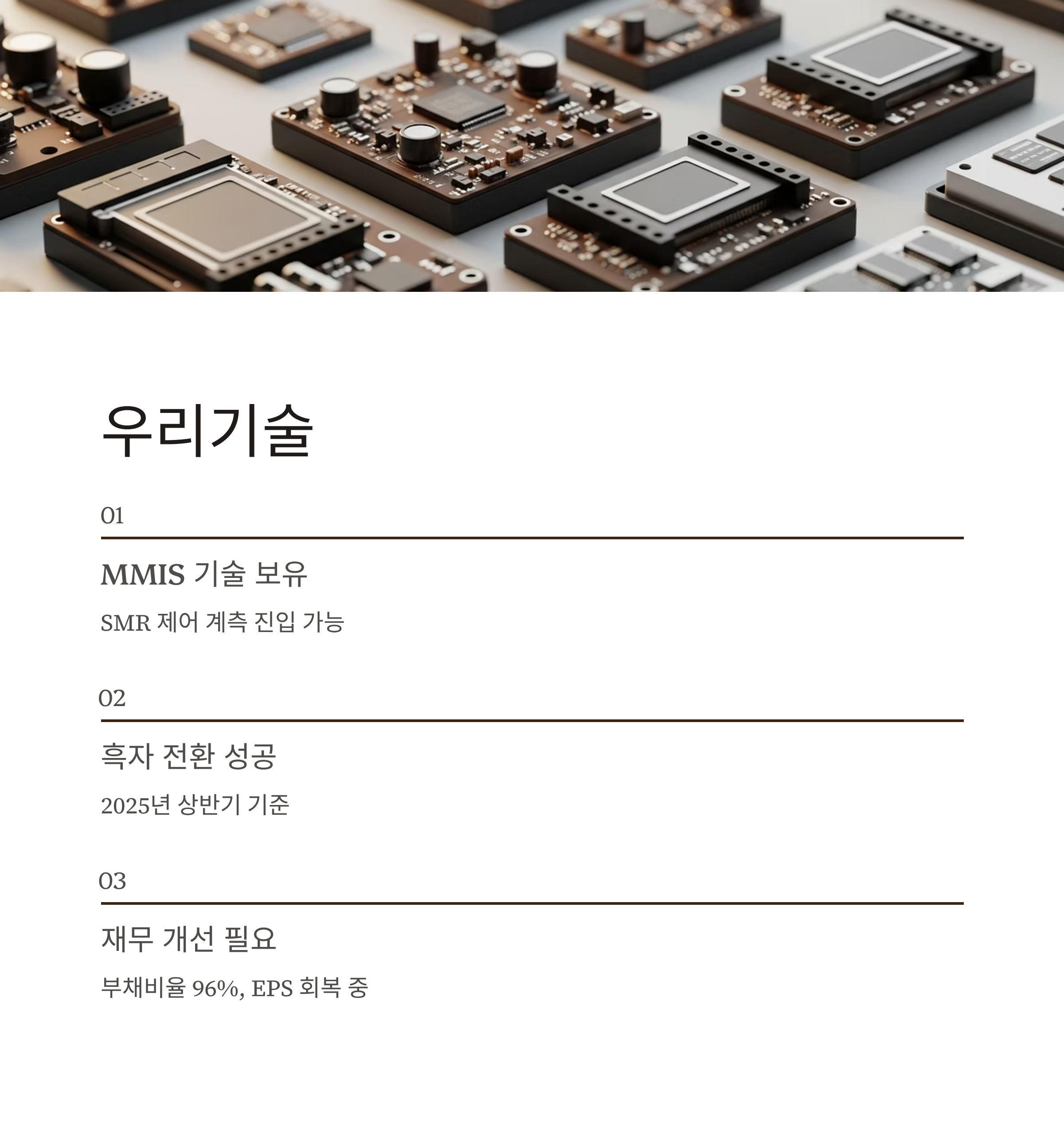 우리기술은 MMIS(Miniature Modular Integrated System) 분야 기술을 바탕으로 SMR 제어 계측 부문 진입 가능성을 보유한 기업입니다. 2025년 상반기 실적 기준으로는 흑자 전환에 성공하며 기대감을 키우고 있으나, 아직 안정적인 이익 구조로 보기에는 이른 상황입니다.