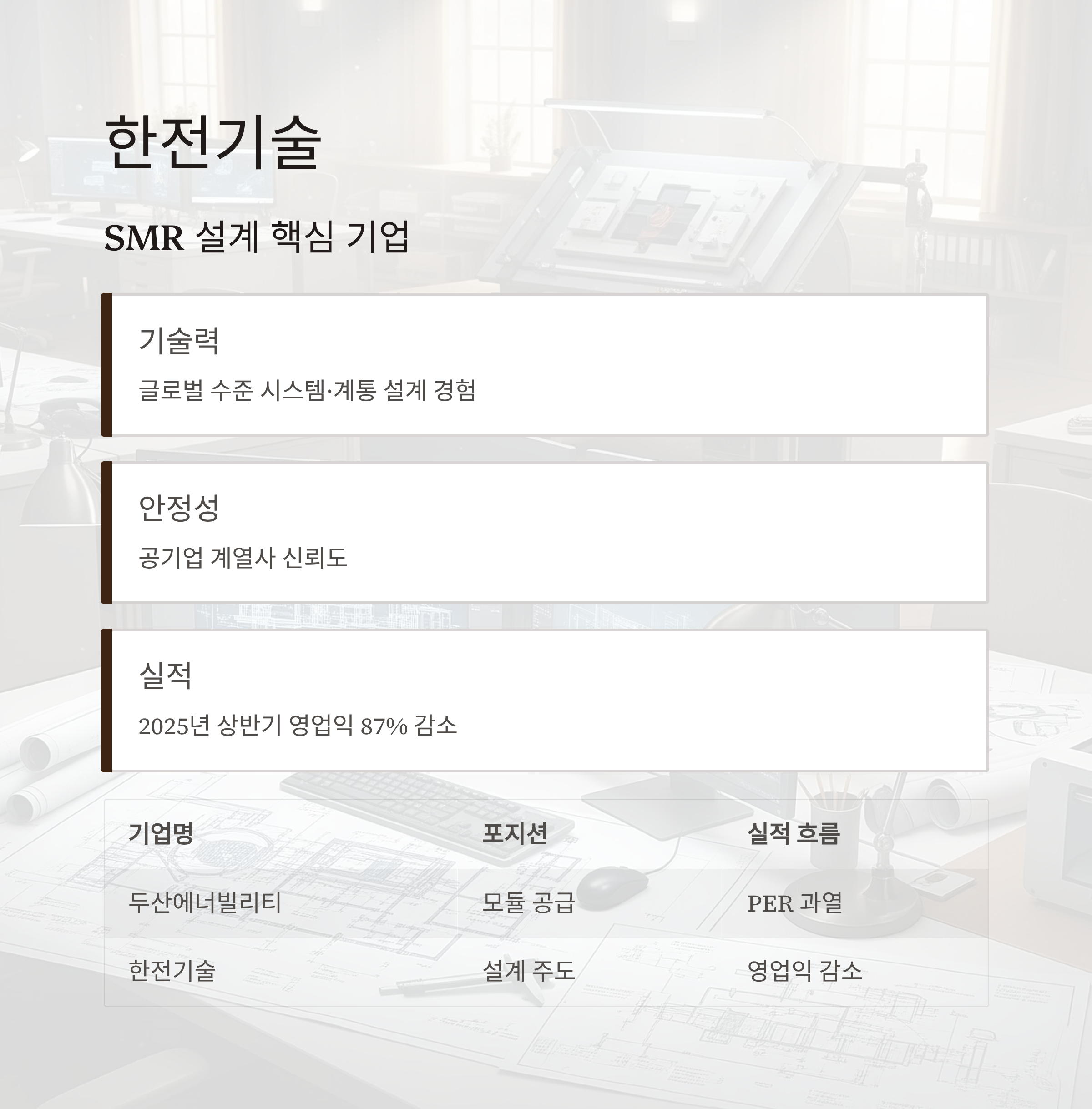 한전기술은 SMR 및 대형 원전 설계 경험을 다수 보유한 공기업 계열사입니다. 시스템 설계·계통 설계에 있어 글로벌 수준의 기술력을 자랑하며, SMR 수주가 본격화되면 설계 부문에서 강한 입지를 가질 수 있다는 분석이 지배적입니다.