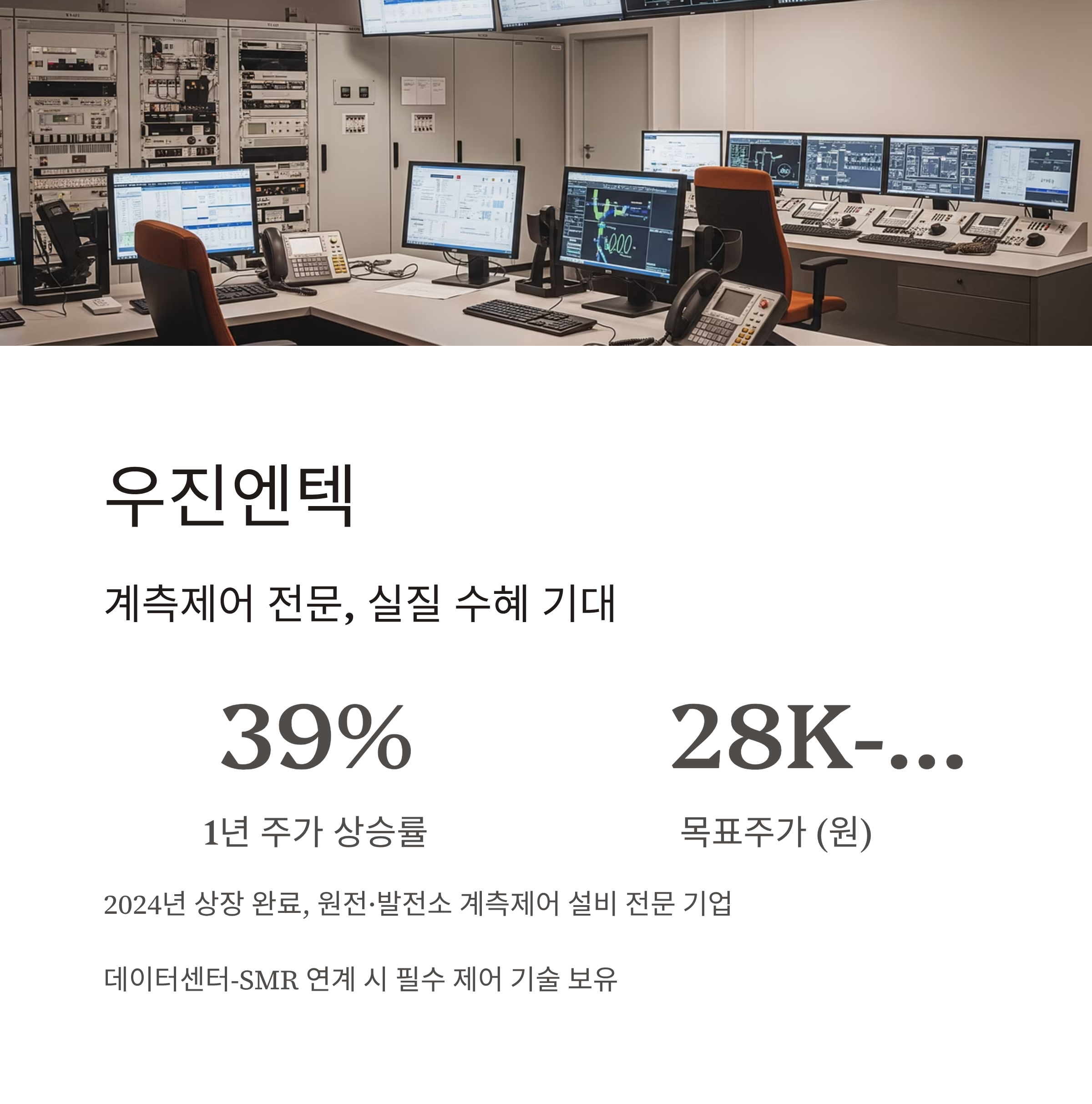 2024년 상장을 완료한 우진엔텍은 원전 및 발전소의 계측·제어 설비 정비와 공급을 전문으로 하는 기업입니다. AI 인프라용 데이터센터가 대형 SMR과 연계될 경우, 해당 설비 제어 기술이 필수적이라는 점에서 수혜 기대감이 큽니다.