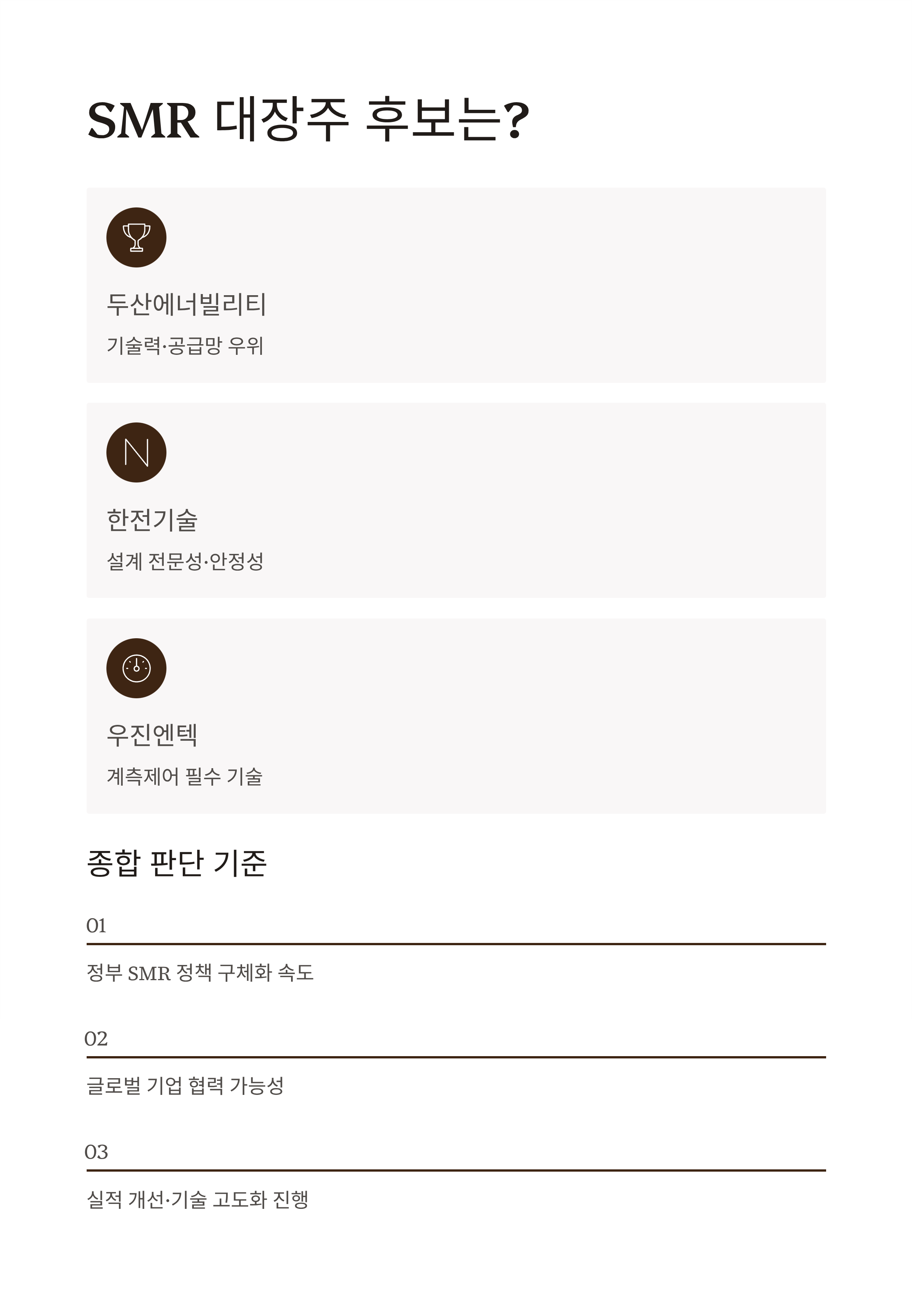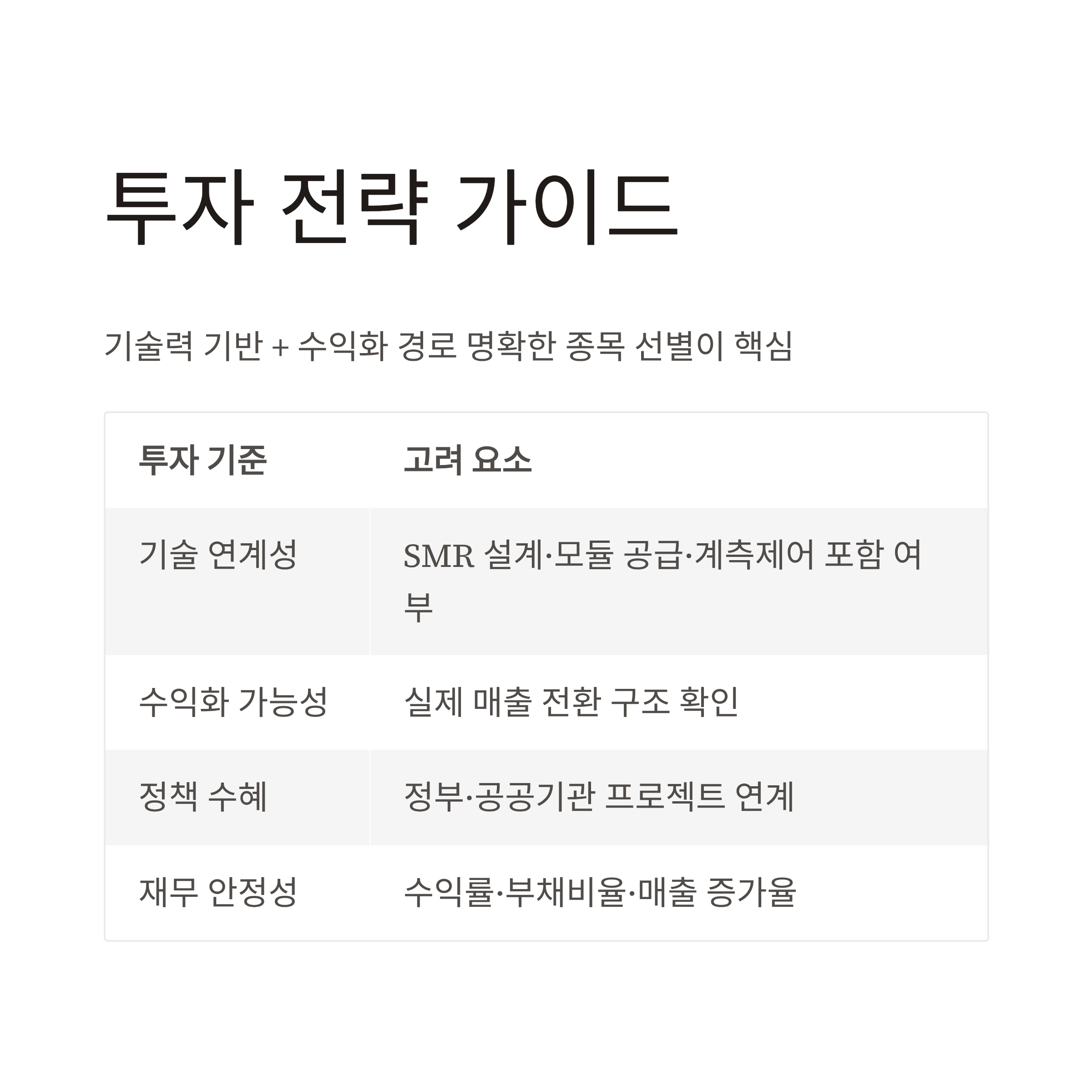 향후 SMR 대장주를 선점하기 위해서는 아래 기준에 주목해보세요.