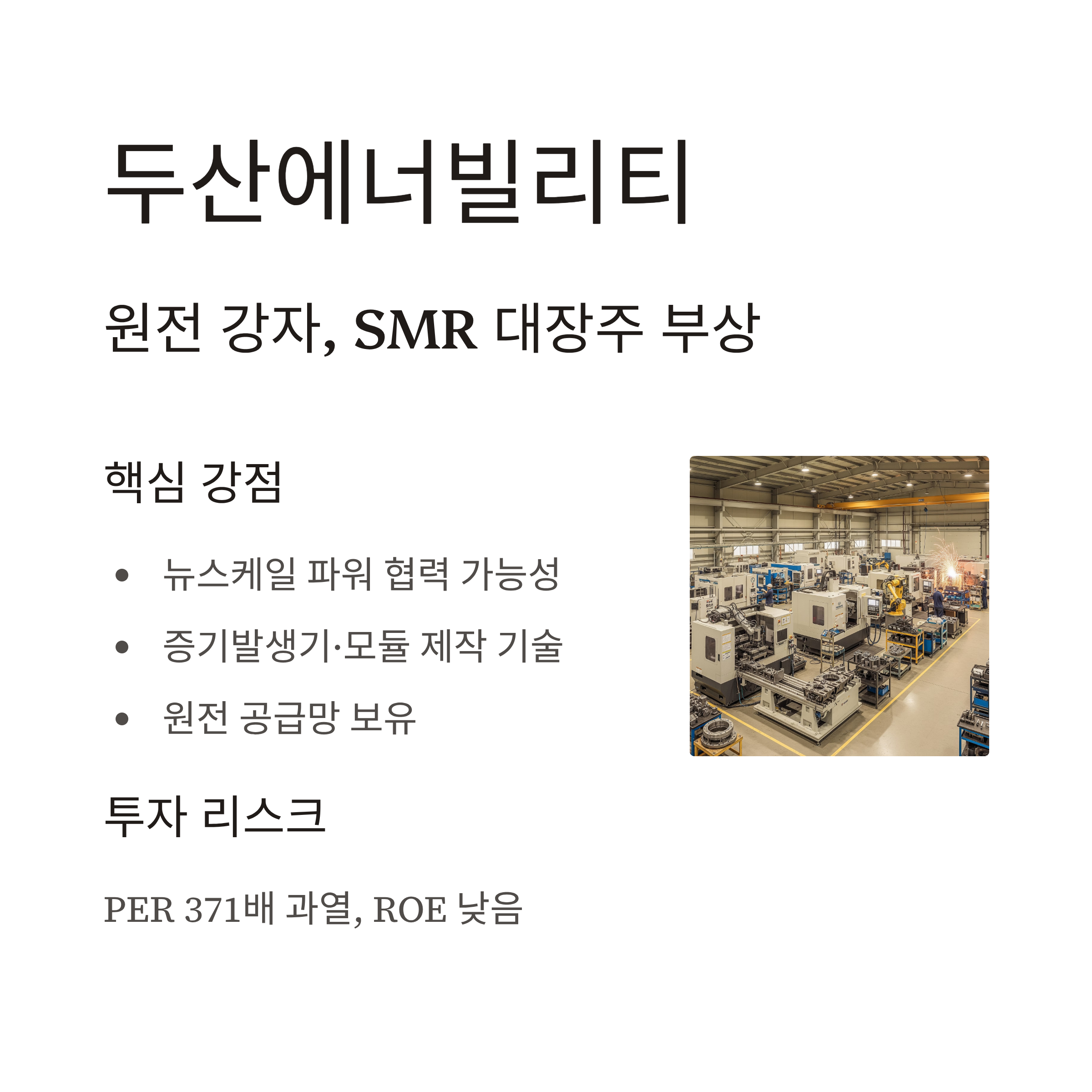 특히 한국 정부가 SMR 관련 정책을 본격화하며 두산의 위상도 높아지고 있습니다. 다만, 최근 높은 PER(371배)과 낮은 ROE는 단기 수익성 리스크로 작용하고 있어, ‘기대감 대비 실적’이 핵심 변수로 떠오르고 있습니다.