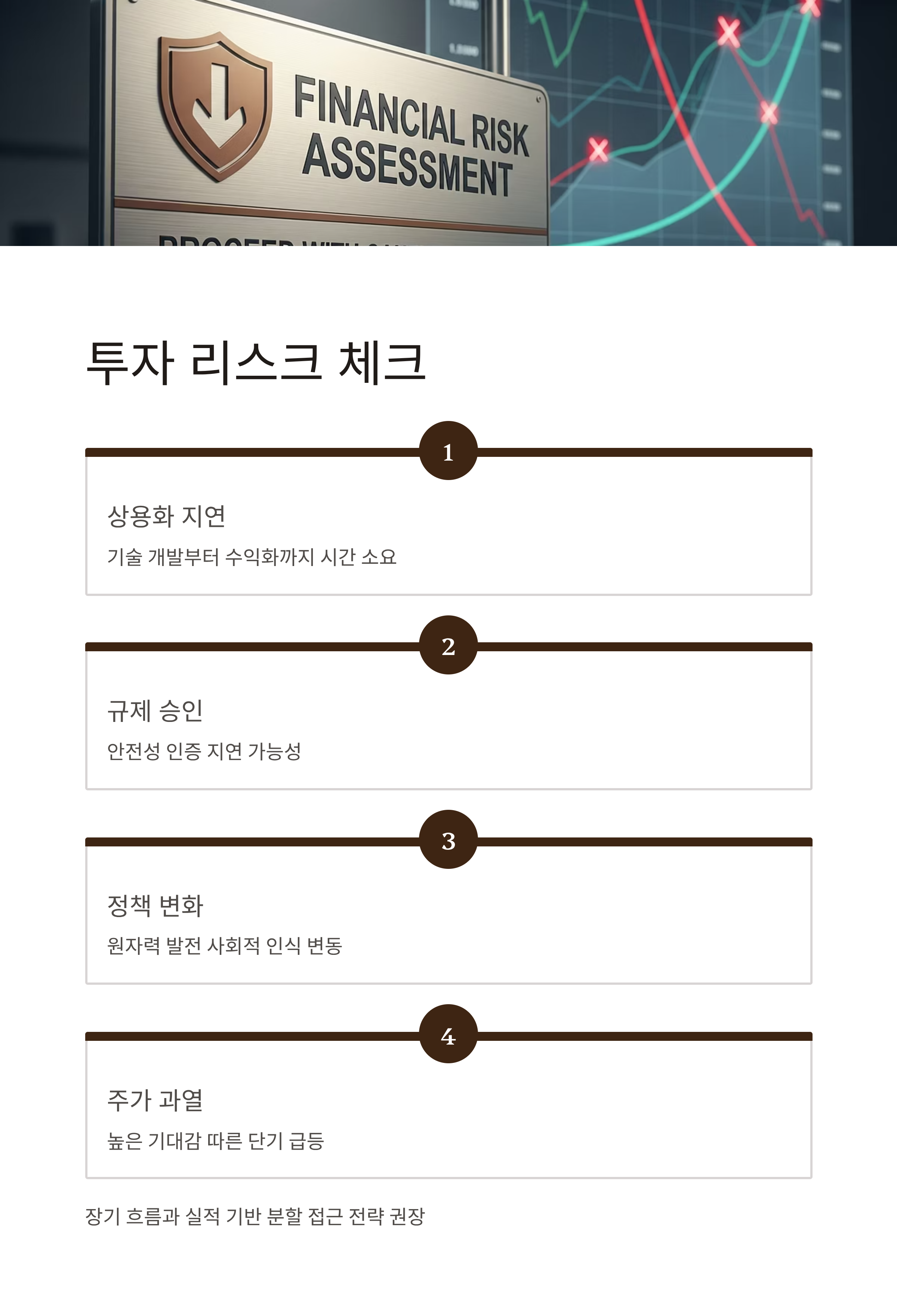SMR 테마주는 매력적인 미래 에너지 솔루션이라는 점에서 기대치가 높은 만큼, 다음과 같은 리스크도 동반합니다.