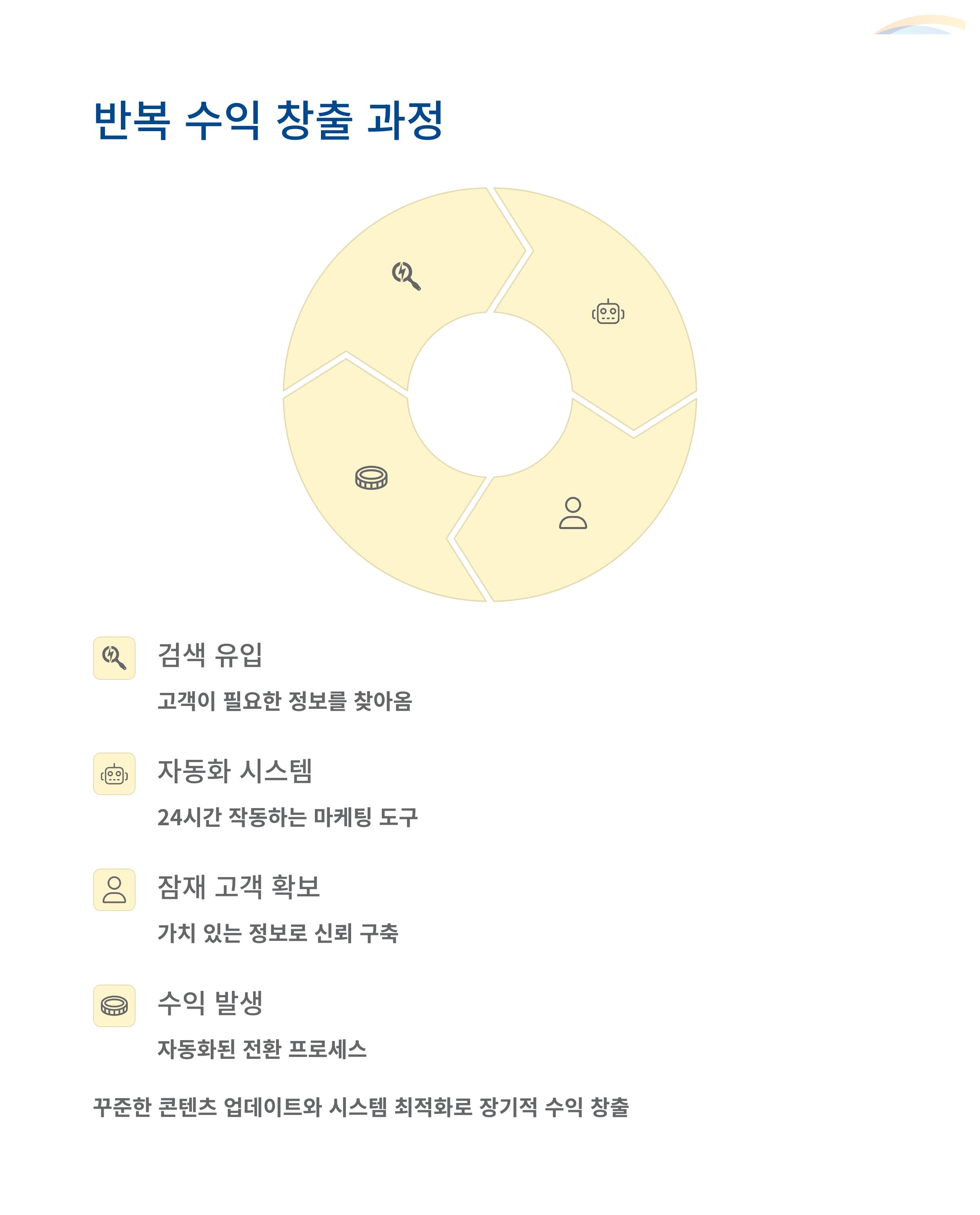 | 유입 구조를 잘 설계하면 홍보 없이도 매출 발생 | 자동화 루트가 있어야 시간 투입 최소화 | 콘텐츠 수 증가 = 유입과 수익 증가 |