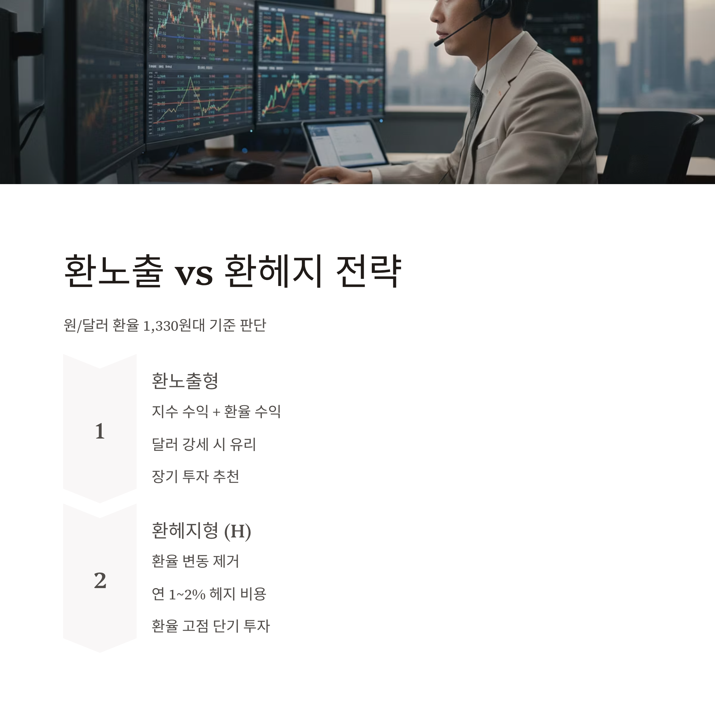 | 환노출형 | 지수 수익 + 환율 수익을 모두 반영 | 달러 강세 예상, 장기 투자 시 유리 |
