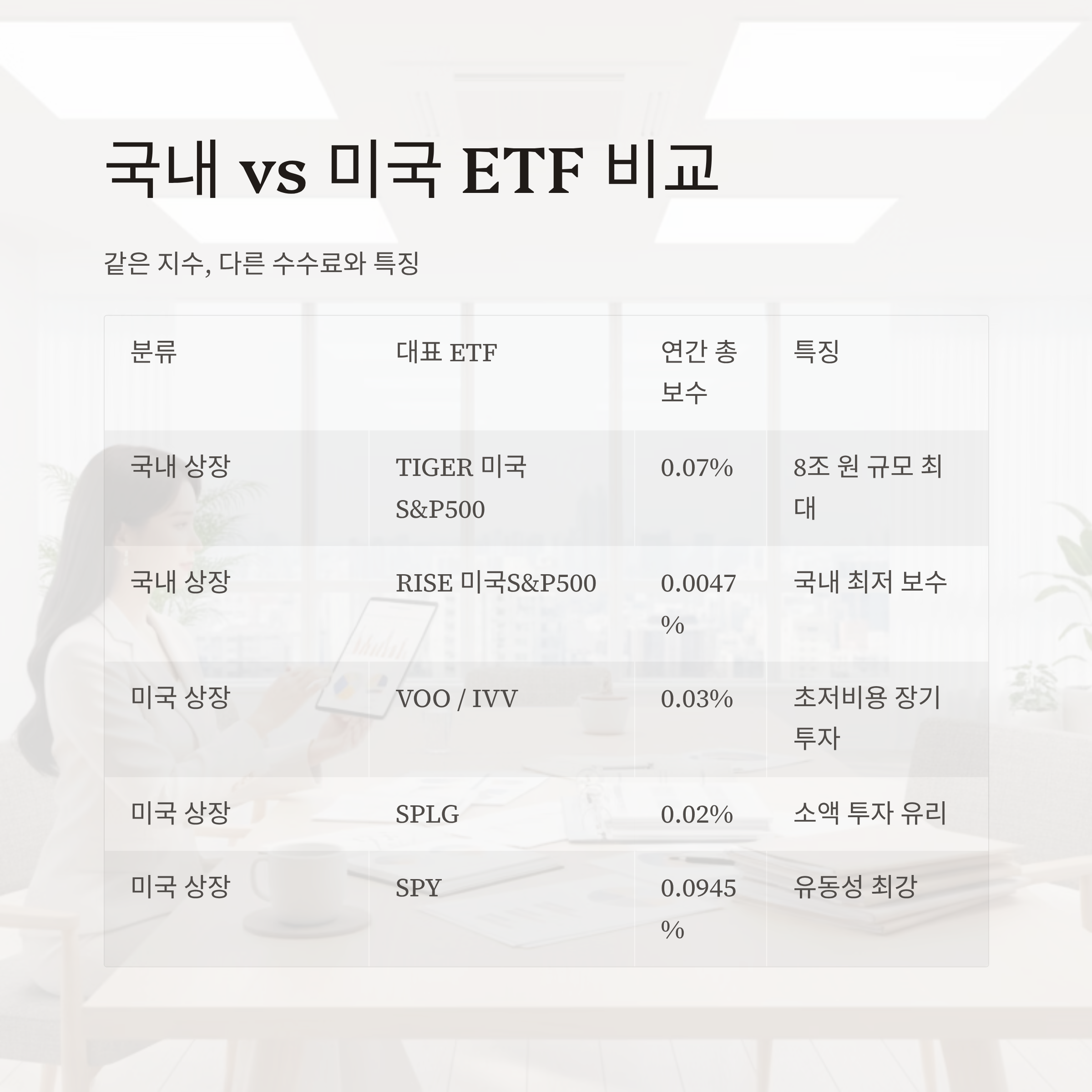 | 미국 상장 | VOO / IVV | 0.03% | 초저비용, 장기 투자자 선호 |