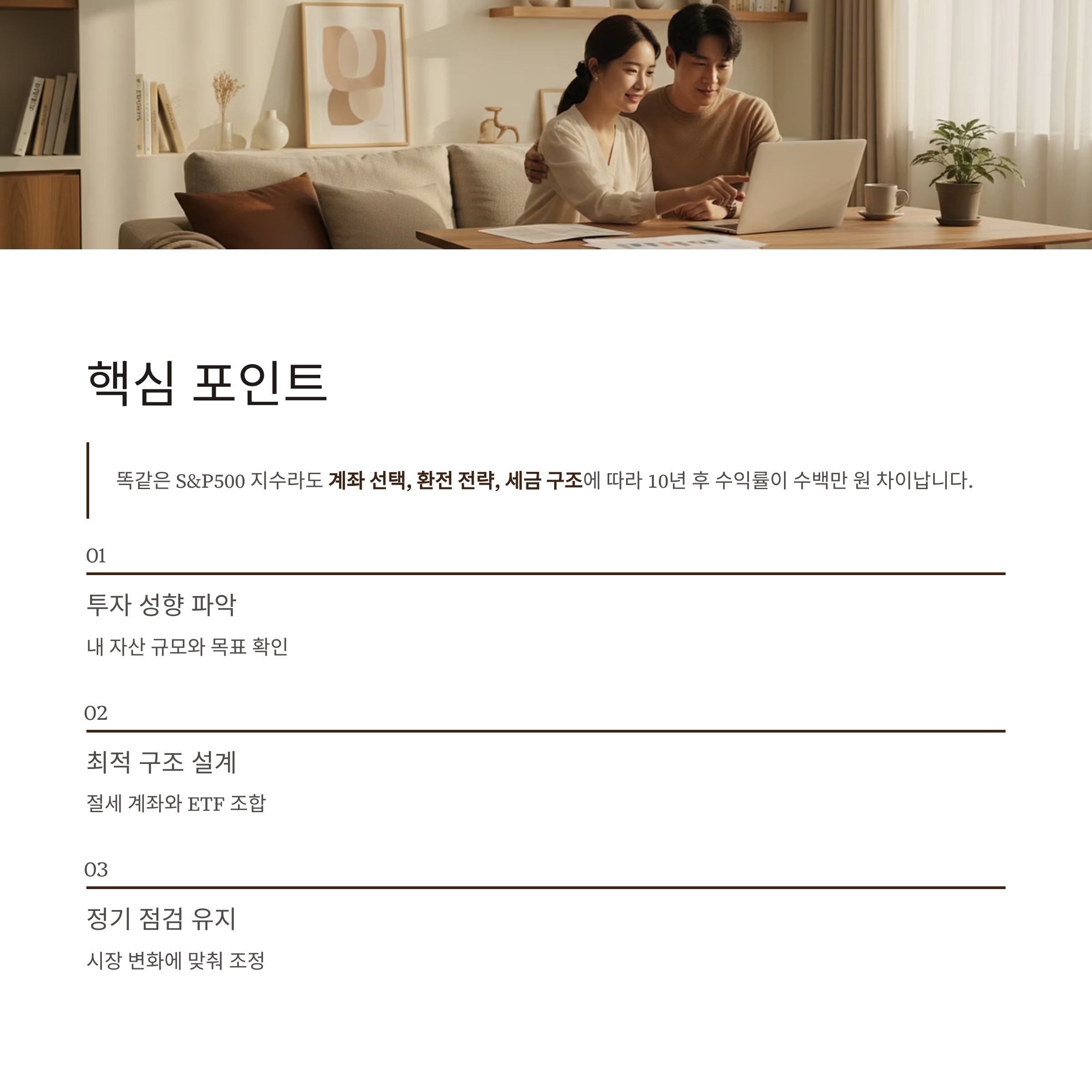 같은 S&P500 지수를 추종해도, 상품마다 수수료·세금·접근성은 천차만별입니다.