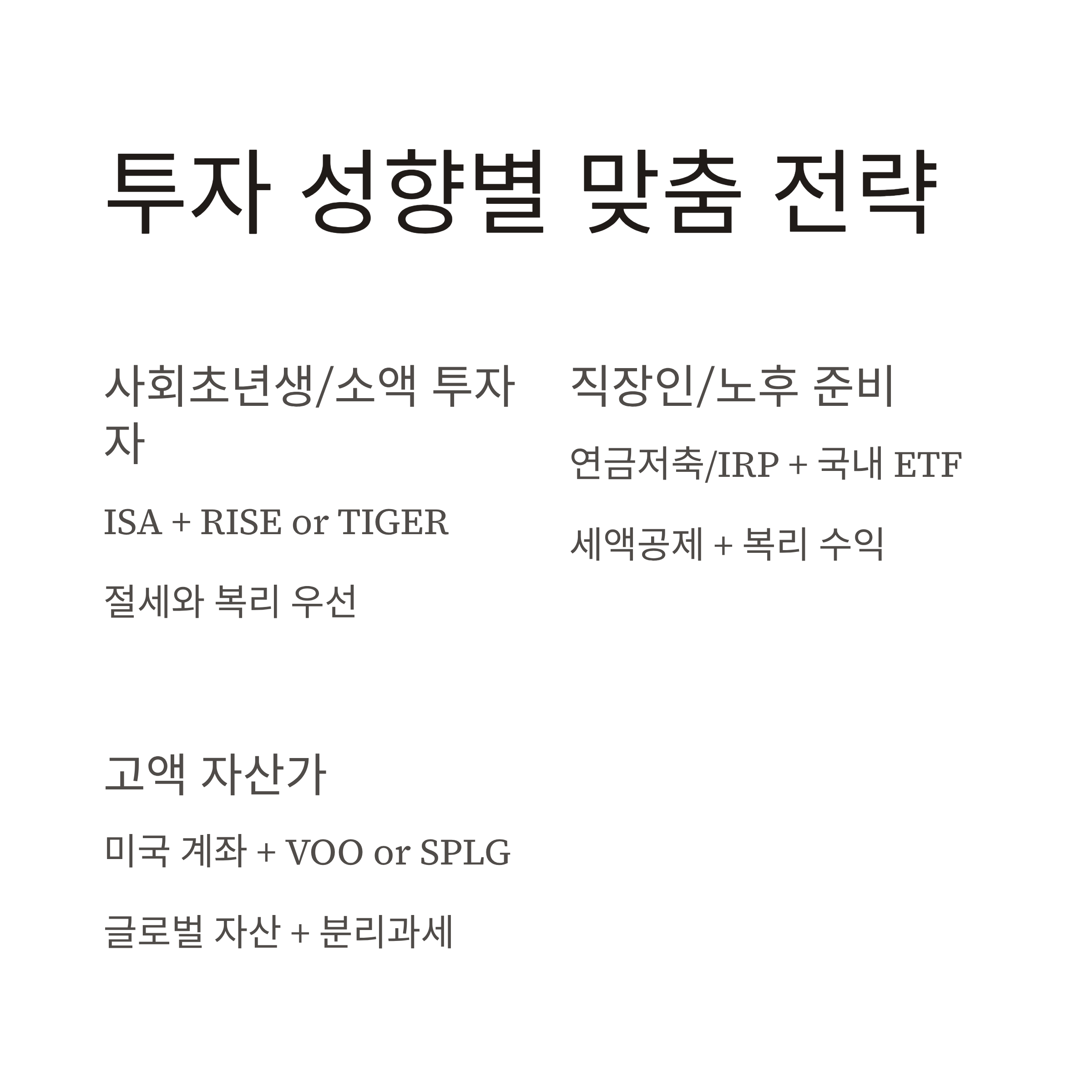 | 사회초년생/소액 투자자 | 절세와 복리 우선 | ISA + RISE or TIGER 미국S&P500 |