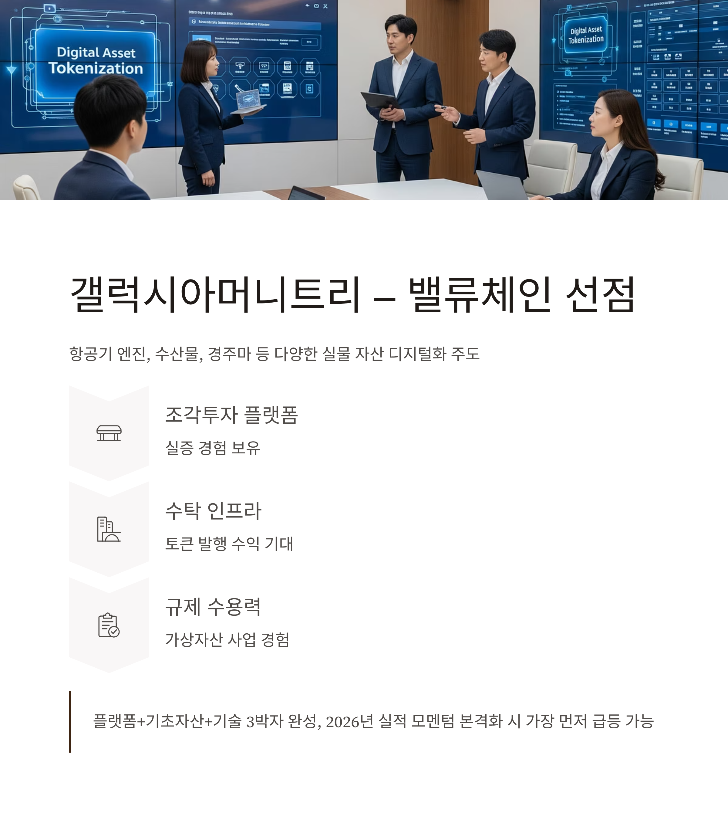| 갤럭시아머니트리 (094480) | 플랫폼·기초자산 운영 | 수탁·유통 밸류체인 완성·자산 다각화 | 기존 본업 수익 비중 여전 |
