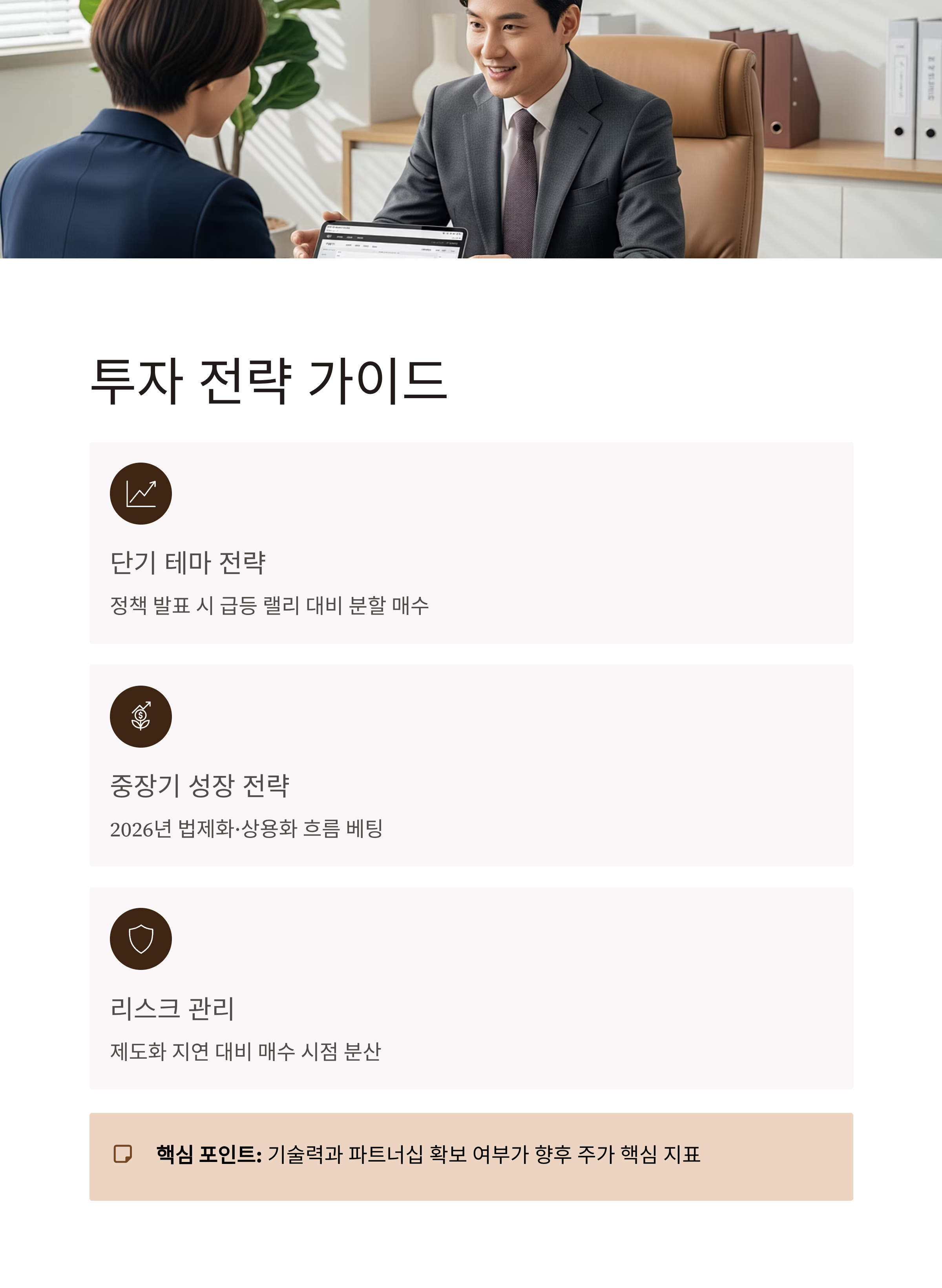 • 정책 발표 시 급등 랠리 가능 → 뉴스 모멘텀 대비 분할 매수 유리