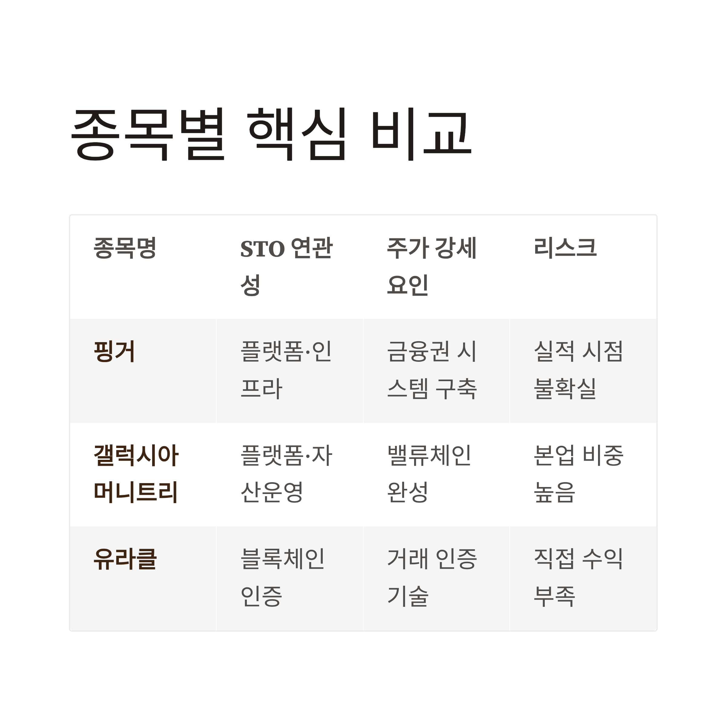 | 유라클 (088340) | 블록체인 인증 기반 | STO 거래 인증 기술 부각 | 직접 수익 구조 부족, 테마 의존성 높음 |
