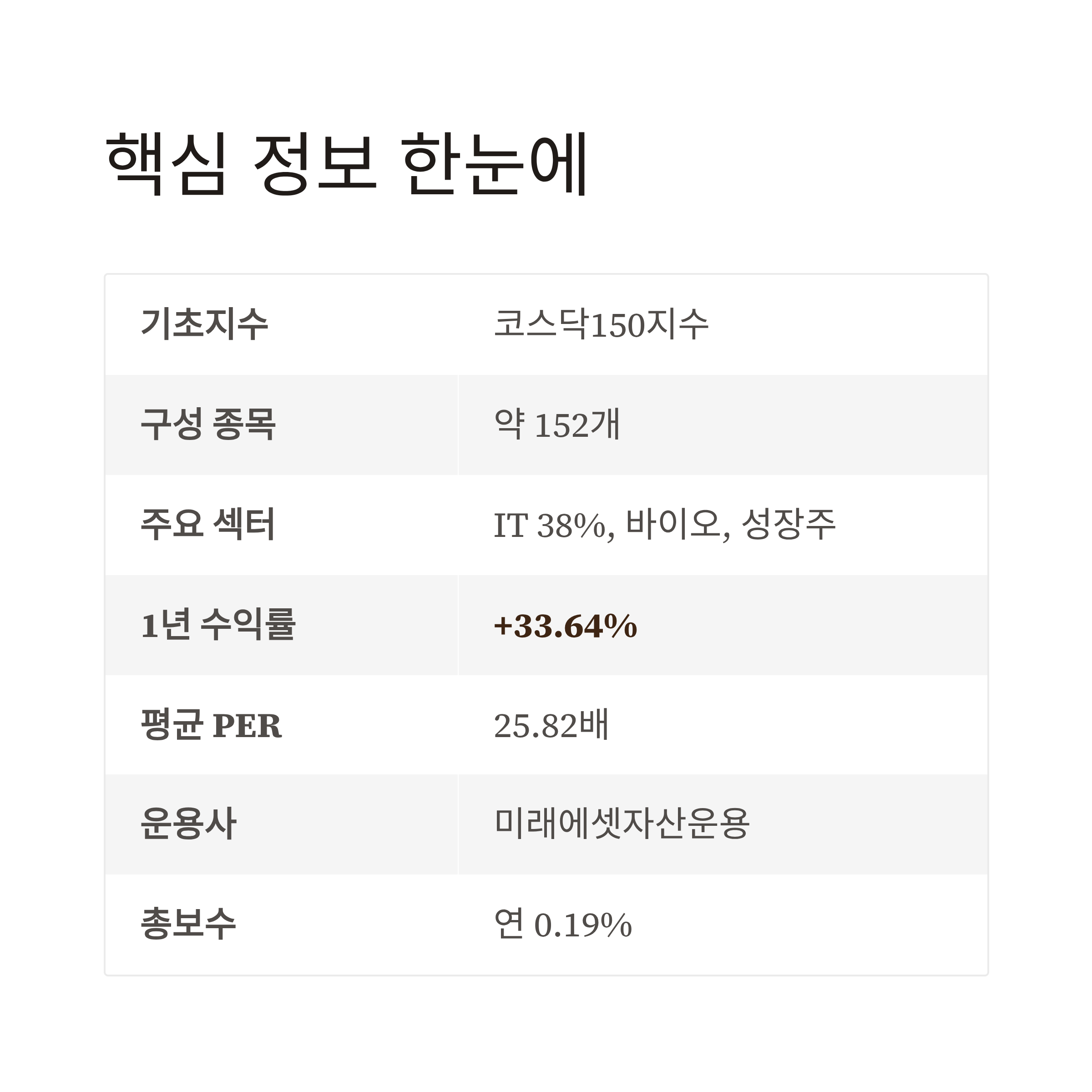 ※ 코스닥150 지수 기준으로 구성되며, 기술·바이오 중심의 중소형 성장주가 상당 비중을 차지합니다.