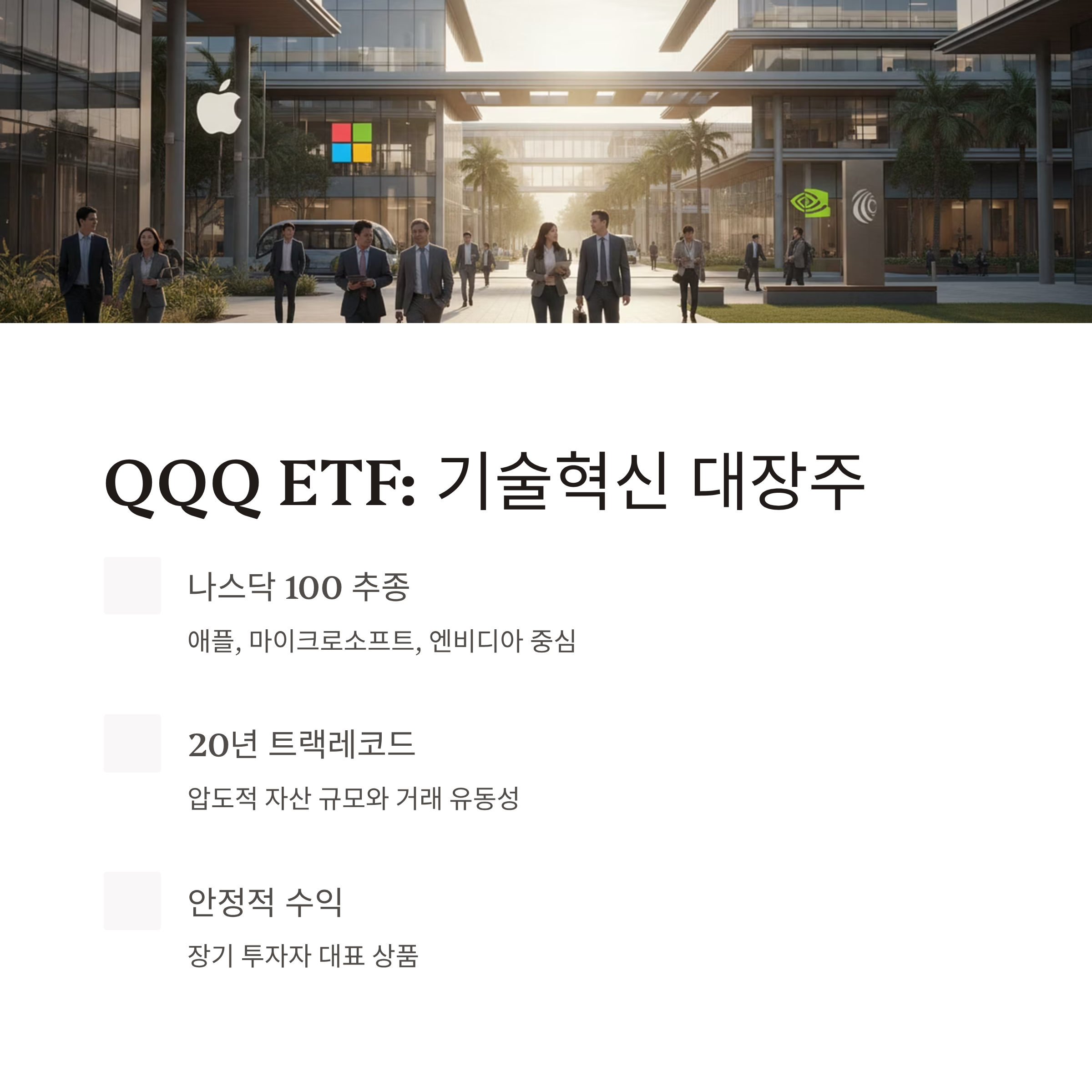 QQQ는 나스닥 100 지수를 추종하며 애플, 마이크로소프트, 엔비디아 등 전 세계 기술 혁신을 이끄는 대형 우량주로 구성된 전통적인 성장 ETF입니다. 트랙레코드가 20년을 넘기고 있으며, 자산 규모와 거래 유동성에서 TSNF와 비교할 수 없는 수준을 자랑합니다. 장기 투자자들에게 안정적인 수익을 제공해 온 대표 상품이죠.