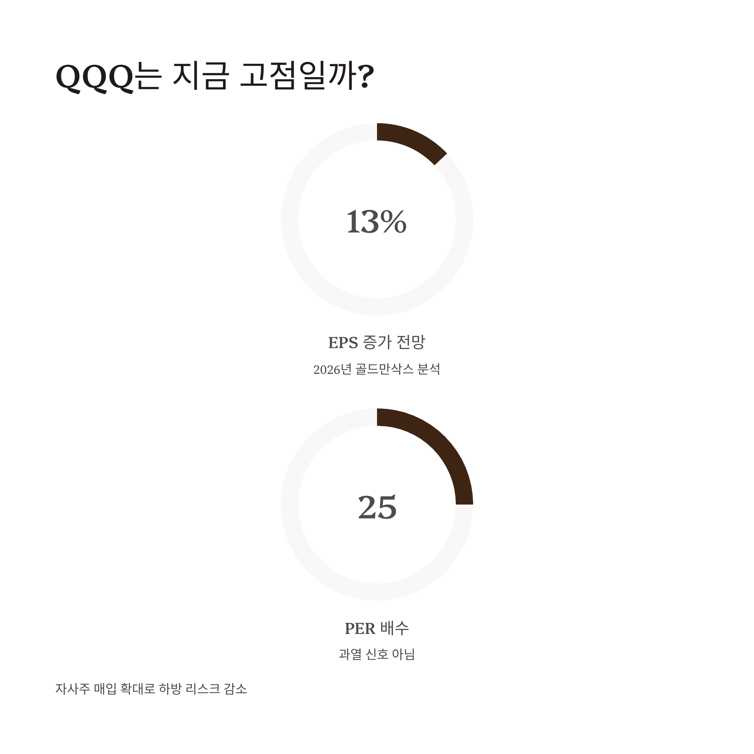 엔비디아, 마이크로소프트 등 QQQ 내 주요 종목은 여전히 강력한 실적을 기반으로 성장하고 있습니다. 특히 골드만삭스는 2026년 QQQ 구성 종목의 EPS가 13% 이상 증가할 것이라 전망했으며, 자사주 매입 확대와 안정적인 수익 구조가 하방 리스크를 줄여주고 있습니다. 또한 PER 25배 수준으로, 밸류에이션 측면에서도 과열 신호는 아닌 것으로 평가됩니다.