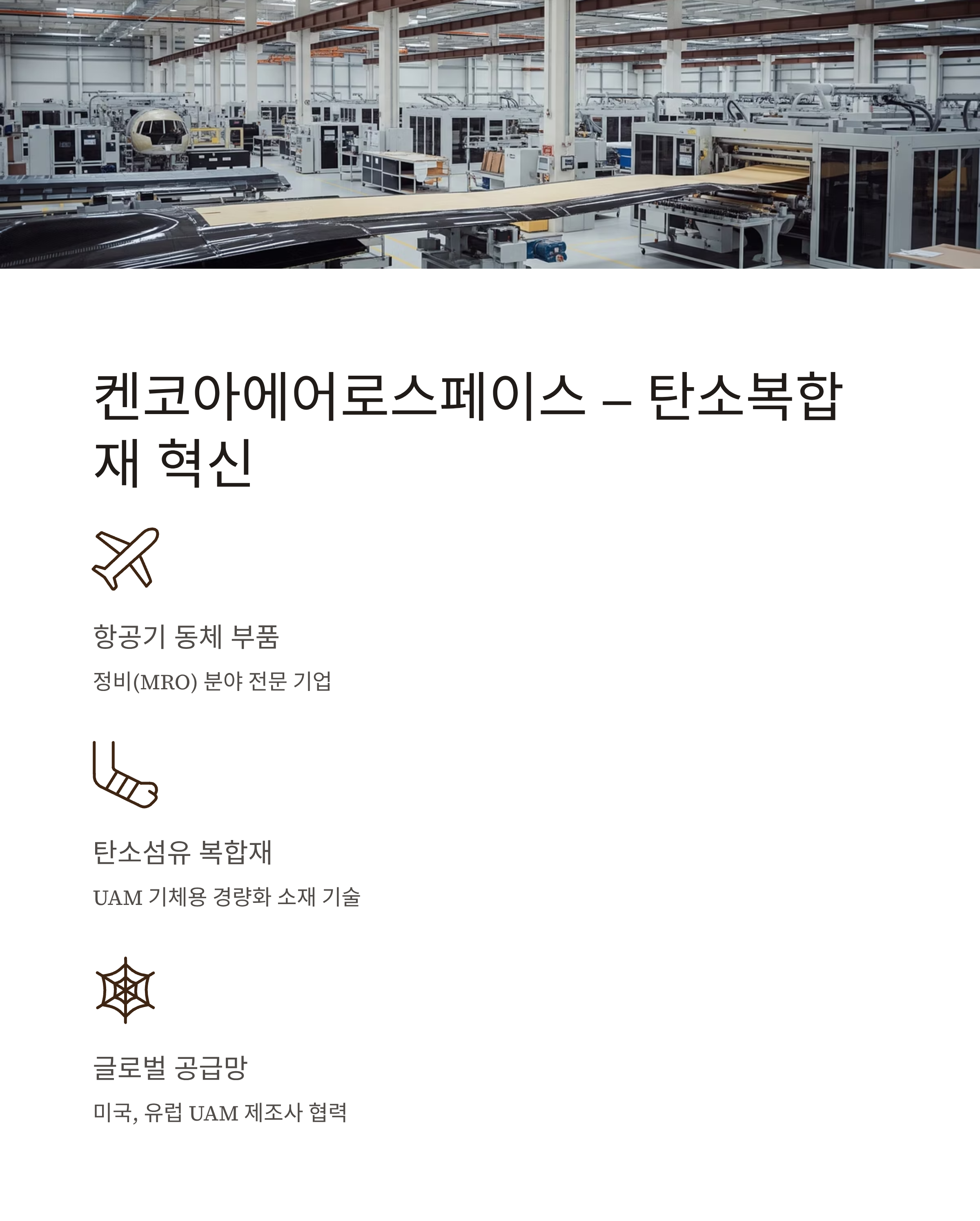 | 켄코아에어로스페이스 | 복합소재·항공기체 부품 | 리포트 없음 | 탄소복합재 기반 기체 제작 기술, 해외 공급망 확장 |