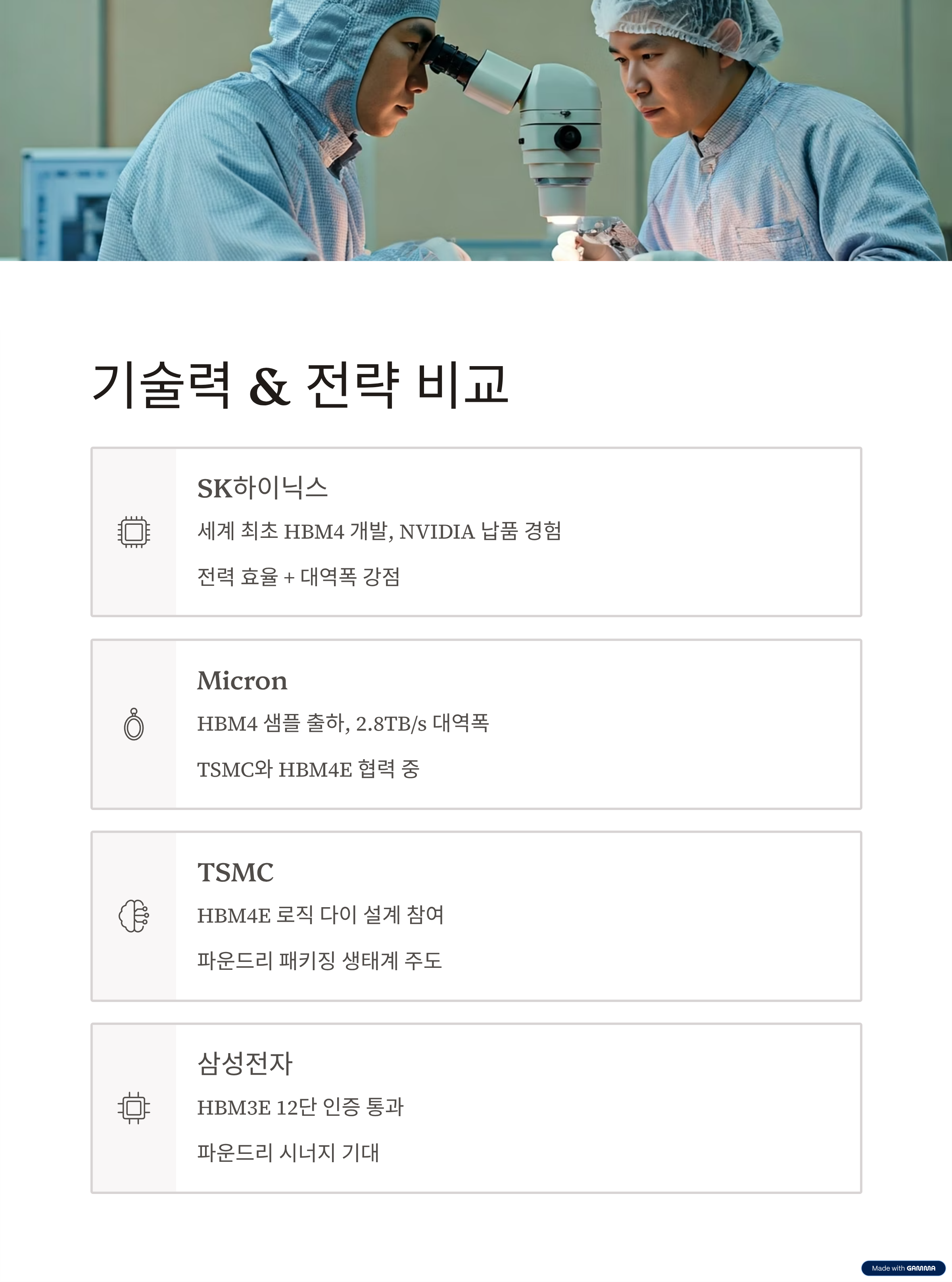 | 삼성전자 | HBM3E 12단 인증 통과, HBM4 샘플 출하 발표. 파운드리 시너지 기대. | 수율 문제 / 출하 지연 가능성 존재. 경쟁 대비 HBM4 일정 늦음 |